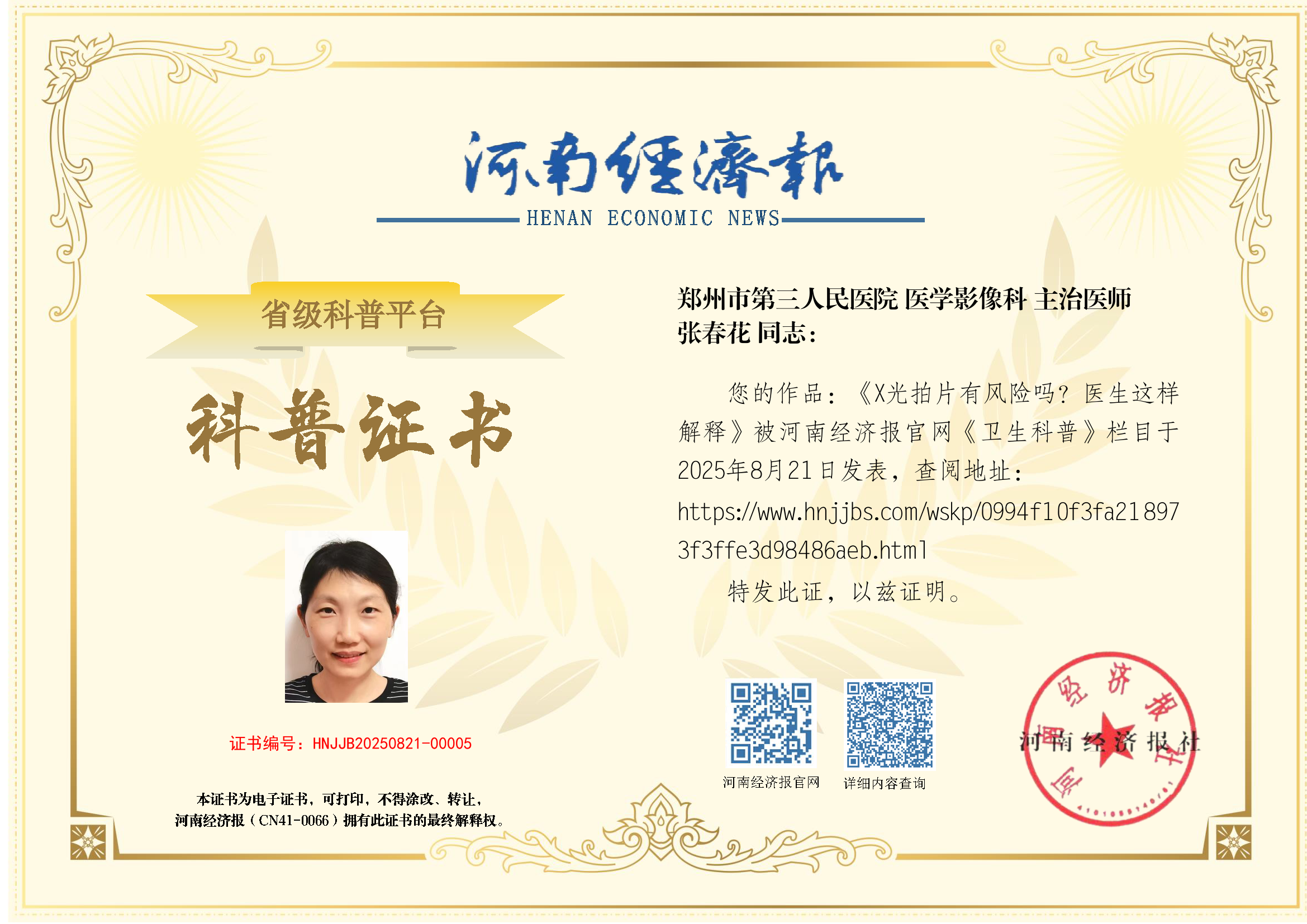(姓名:张春花;医院:郑州市第三人民医院;职称:主治医师;科室:医学影像科)
