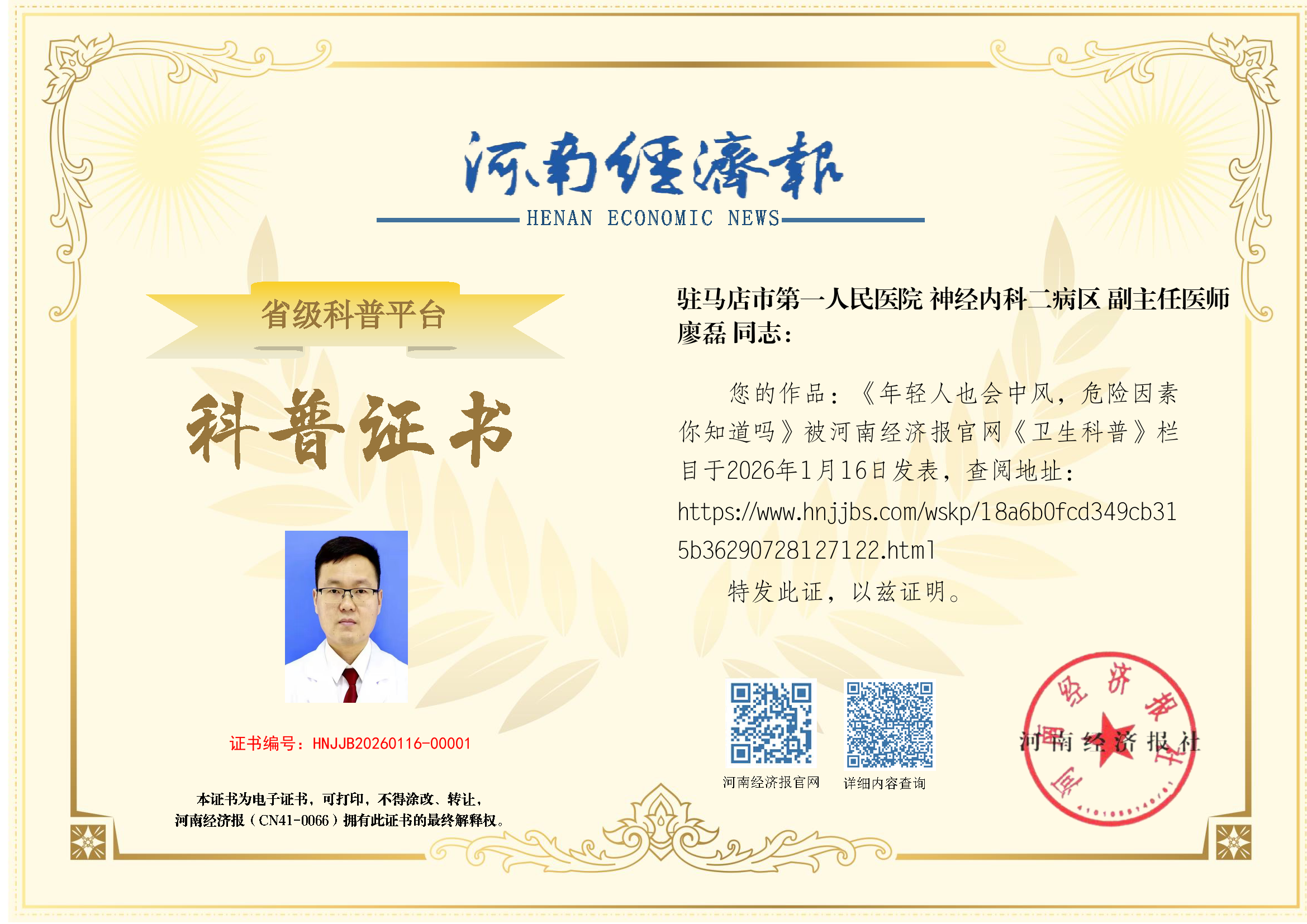 (姓名:廖磊;医院:驻马店市第一人民医院;科室:神经内科二病区;职称:副主任医师)