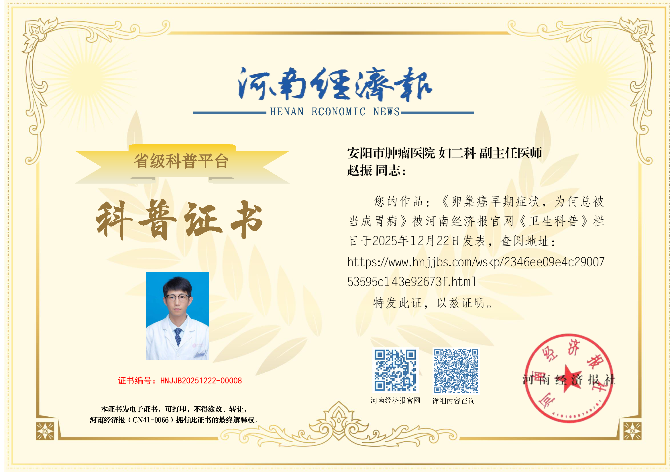 (姓名:赵振;医院:安阳市肿瘤医院;科室:妇二科;职称:副主任医师)