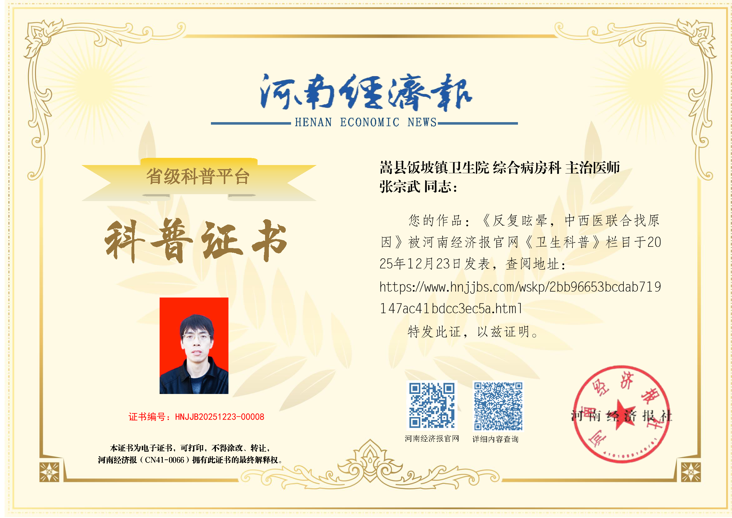 (姓名:张宗武;医院:嵩县饭坡镇卫生院;科室:综合病房科;职称:主治医师)
