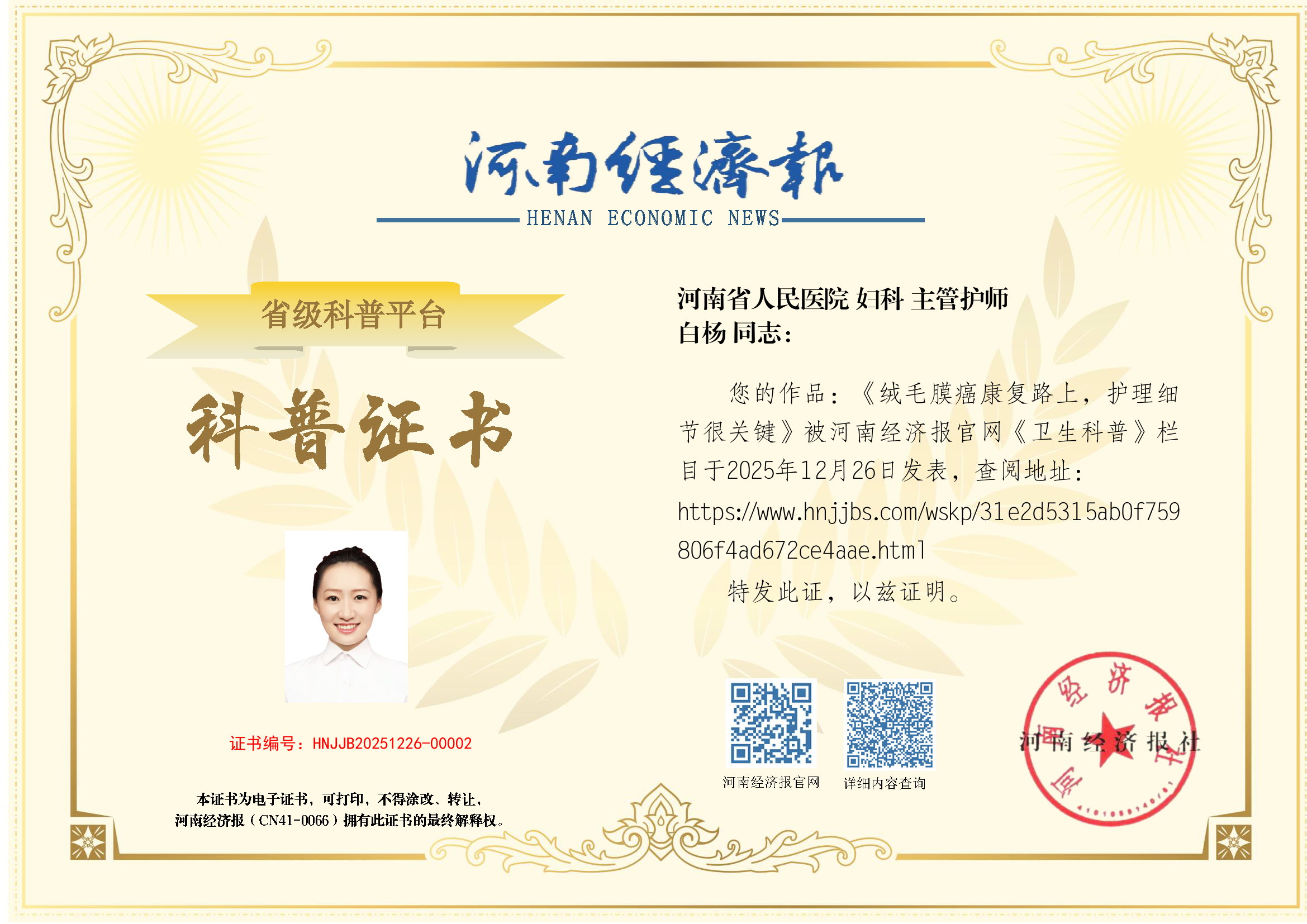 (姓名:白杨;医院:河南省人民医院;科室:妇科;职称:主管护师)