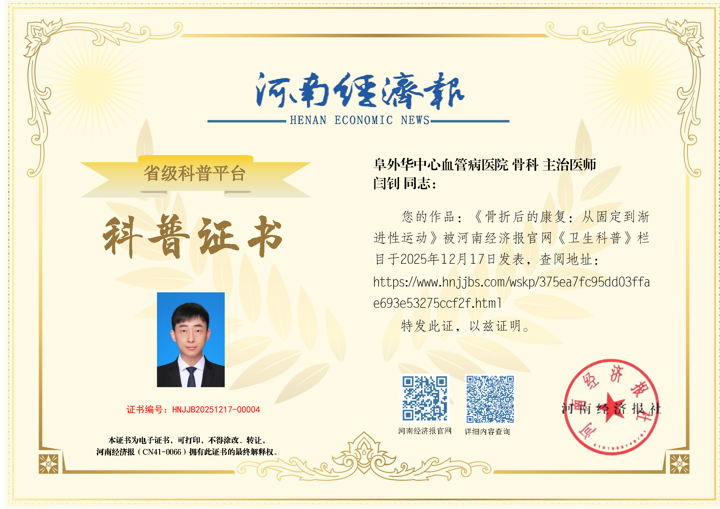(作者:闫钊;单位:阜外华中心血管病医院;科室:骨科;职称:主治医师)