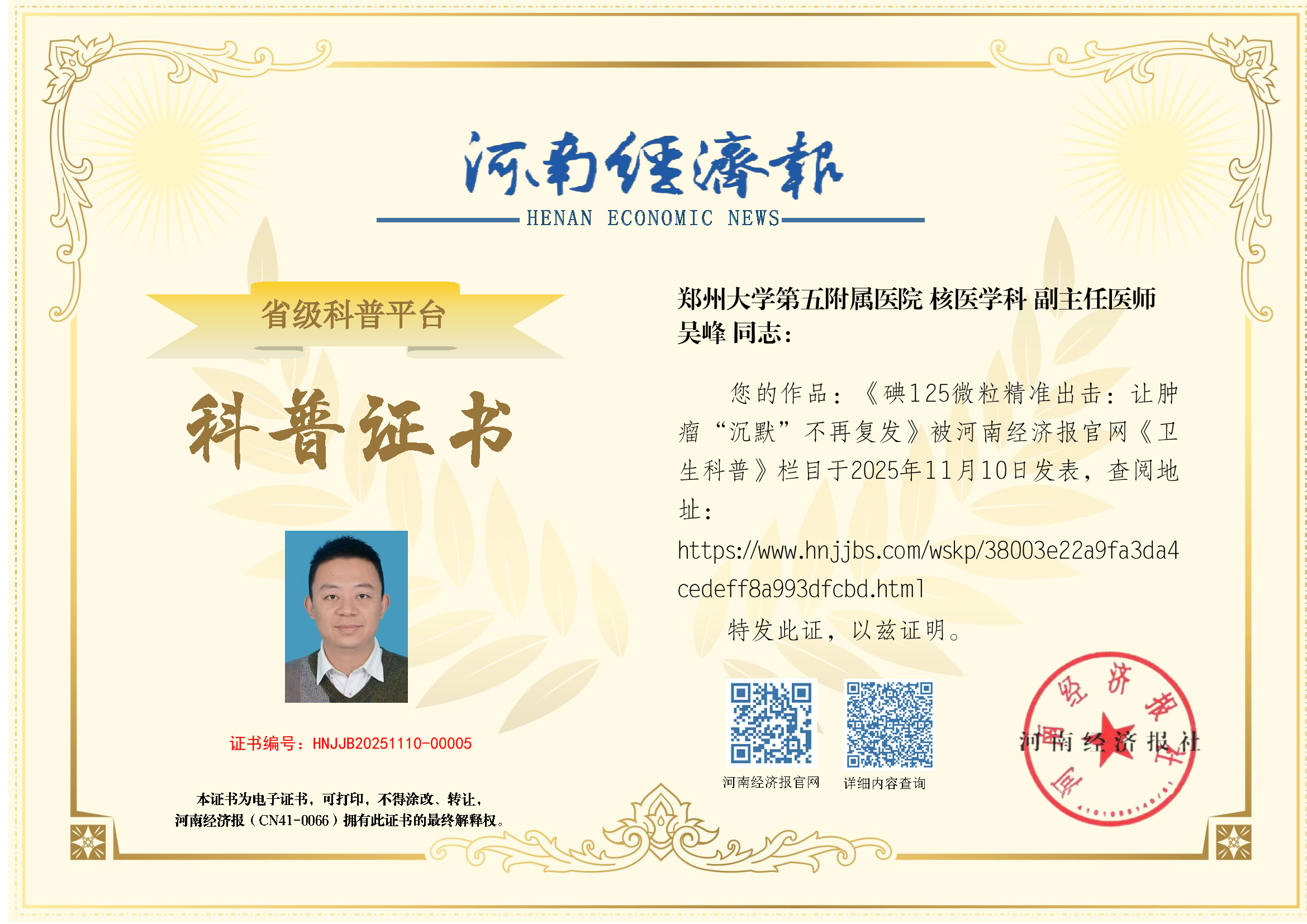 (姓名:吴峰;医院:郑州大学第五附属医院;科室:核医学科;职称:副主任医师)