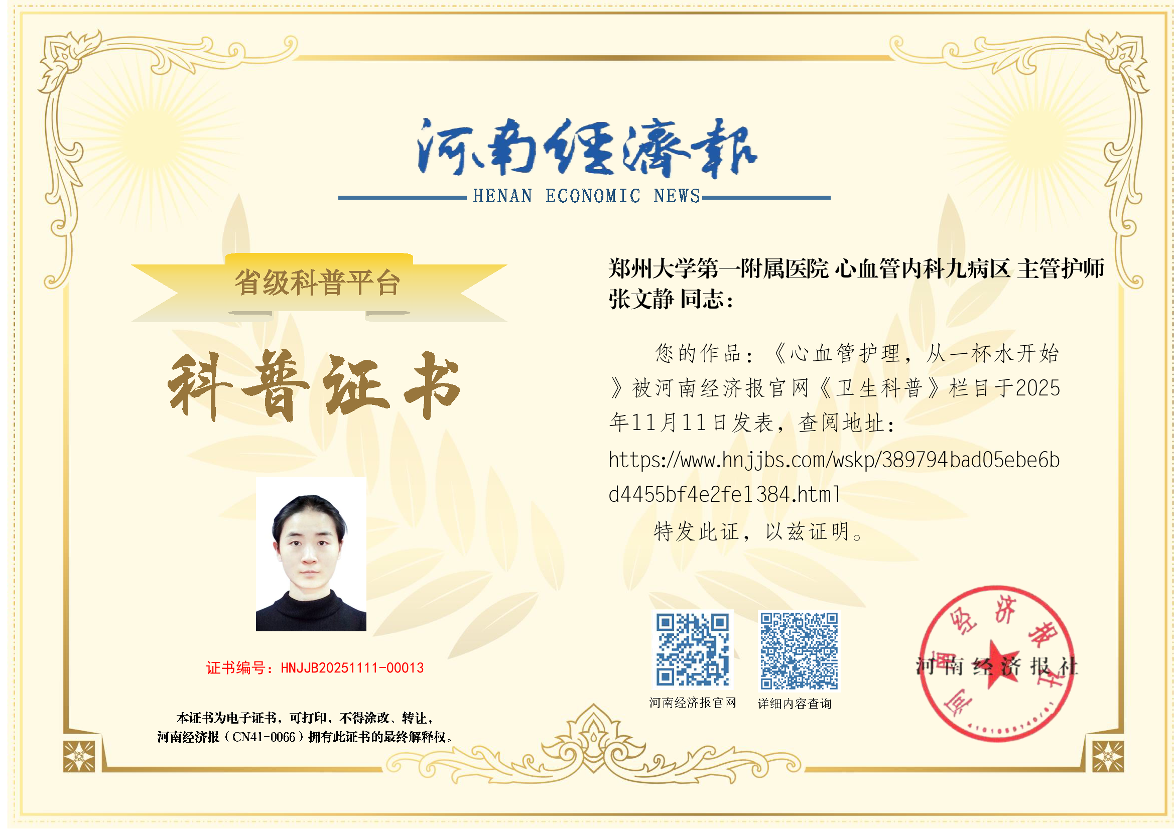 (姓名:张文静;医院:郑州大学第一附属医院;科室:心血管内科九病区;职称:主管护师)