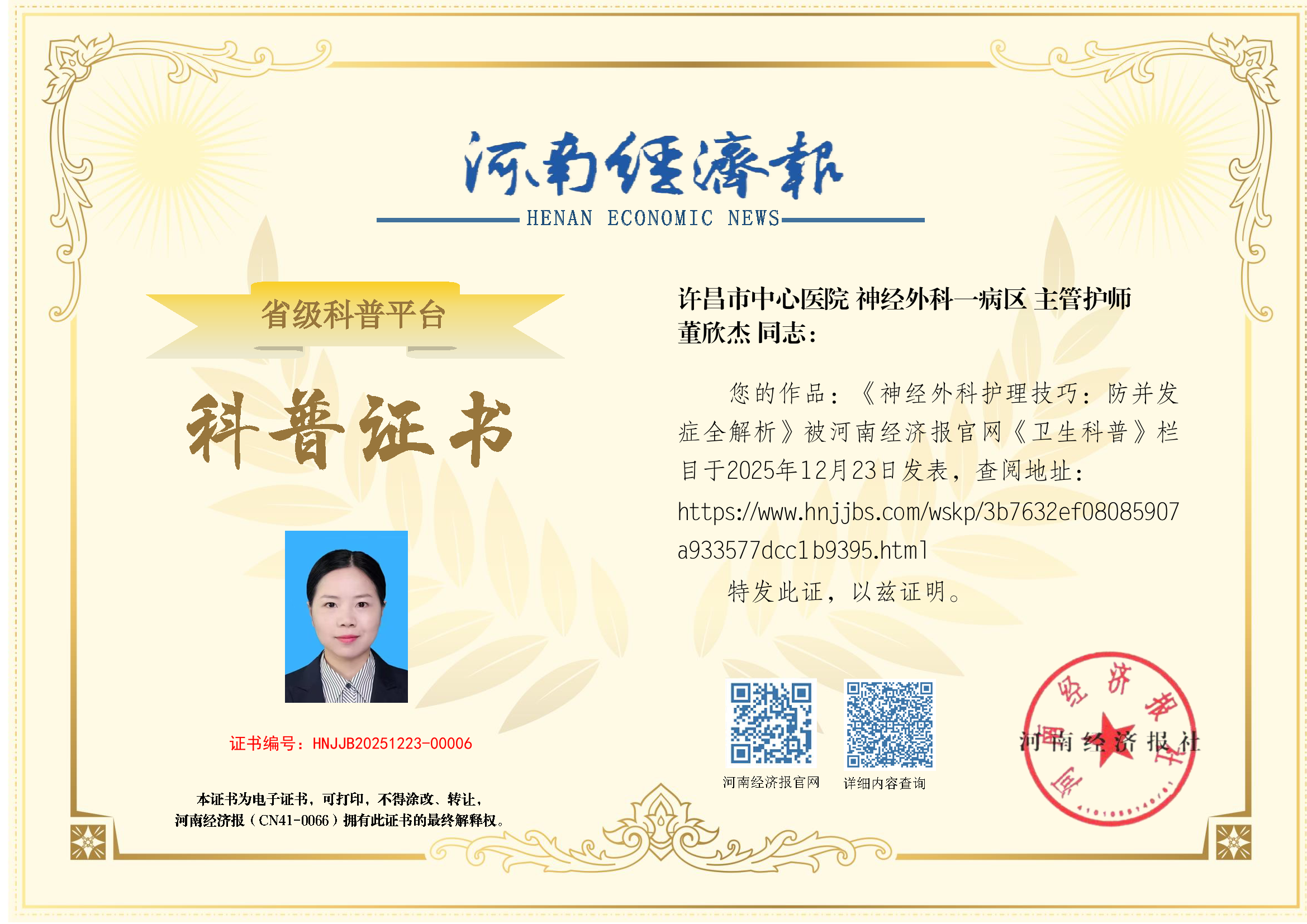(姓名:董欣杰;医院:许昌市中心医院;科室:神经外科一病区;职称:主管护师)
