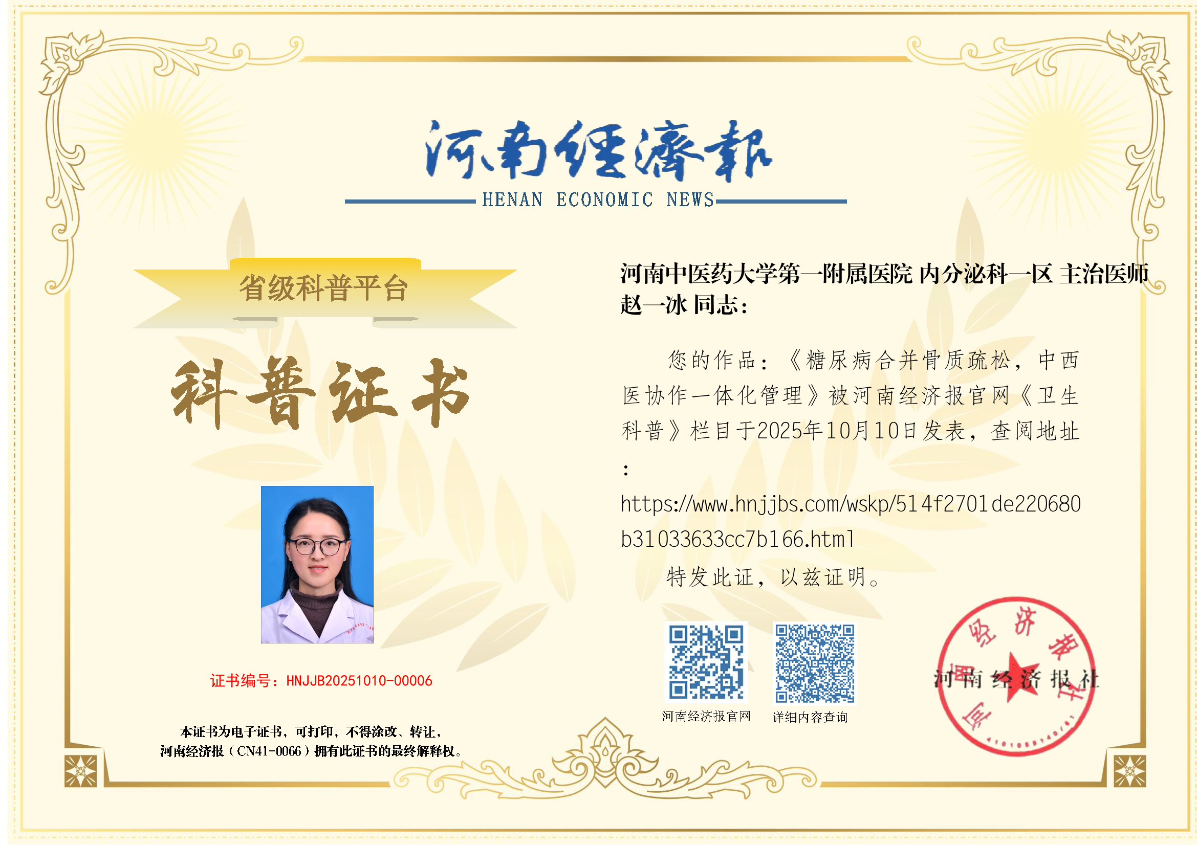 (姓名:赵一冰;医院:河南中医药大学第一附属医院;科室:内分泌科一区;职称:主治医师)