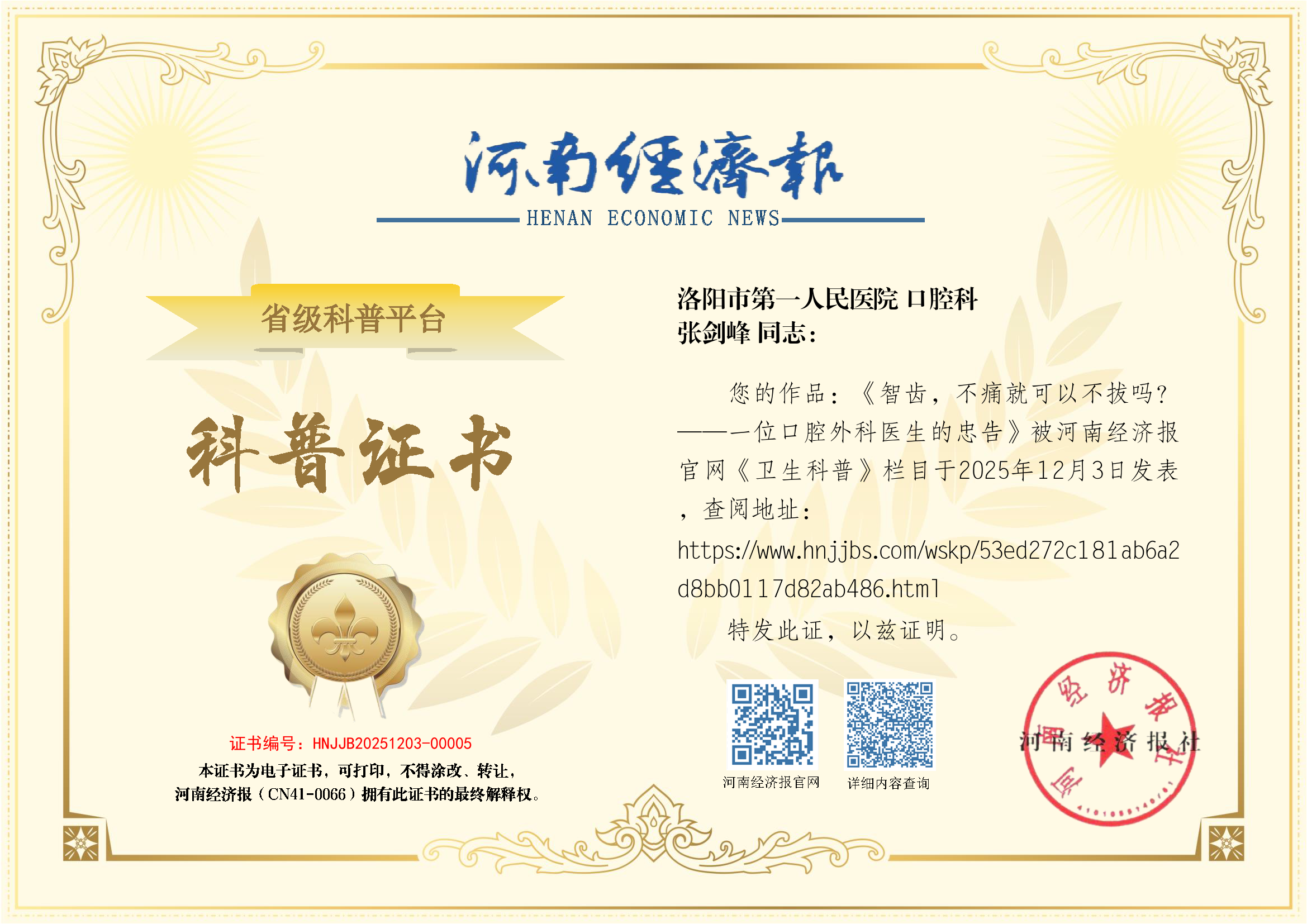 (姓名:张剑峰;单位:洛阳市第一人民医院;科室:口腔科)