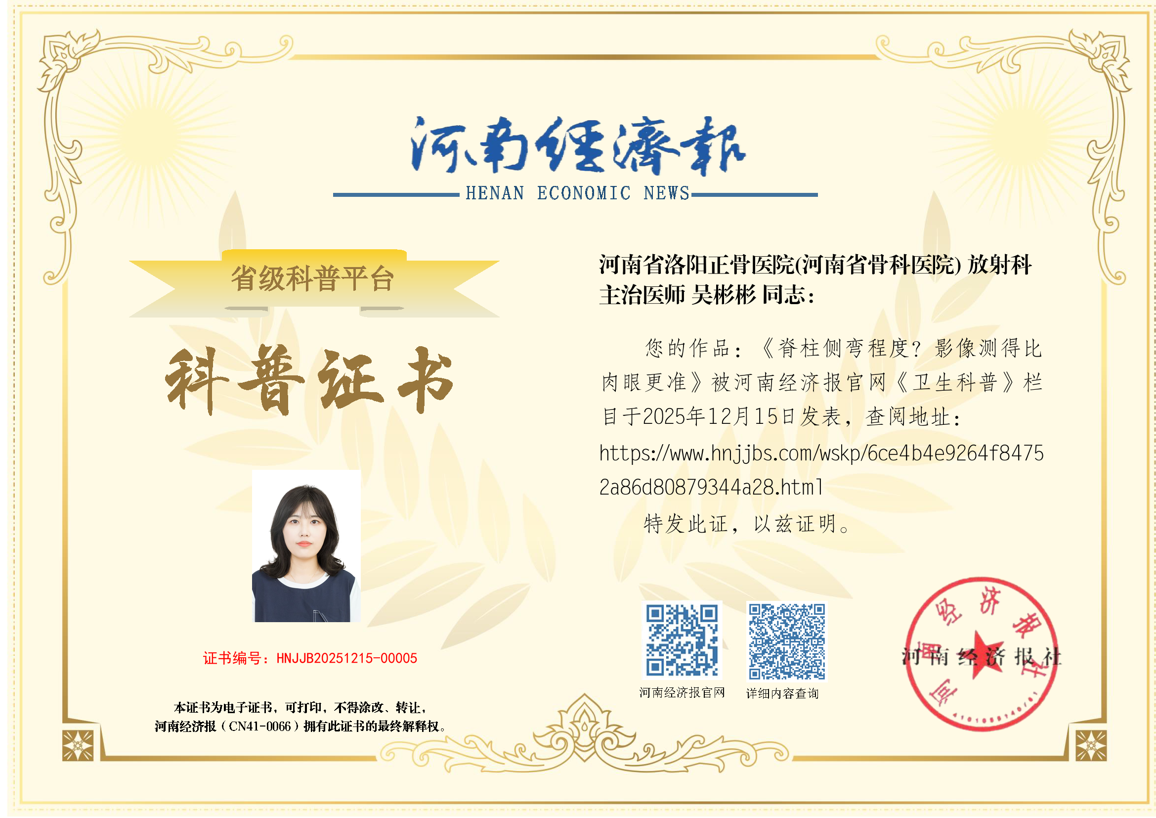 (姓名:吴彬彬;医院:河南省洛阳正骨医院(河南省骨科医院);科室:放射科;职称:主治医师)