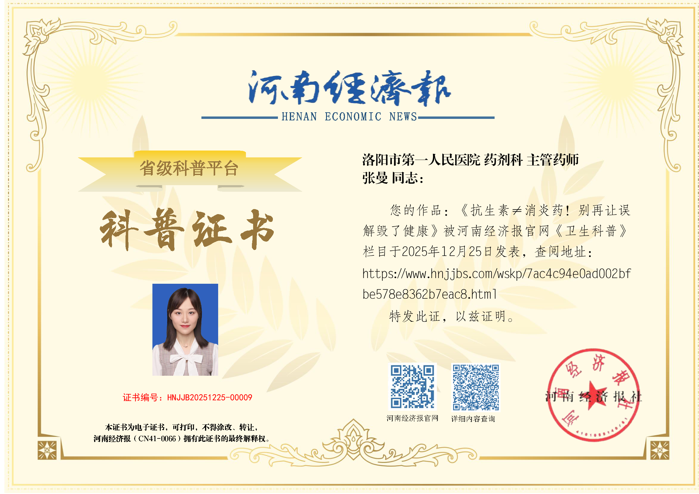 (姓名:张曼;医院:洛阳市第一人民医院;科室:药剂科;职称:主管药师)