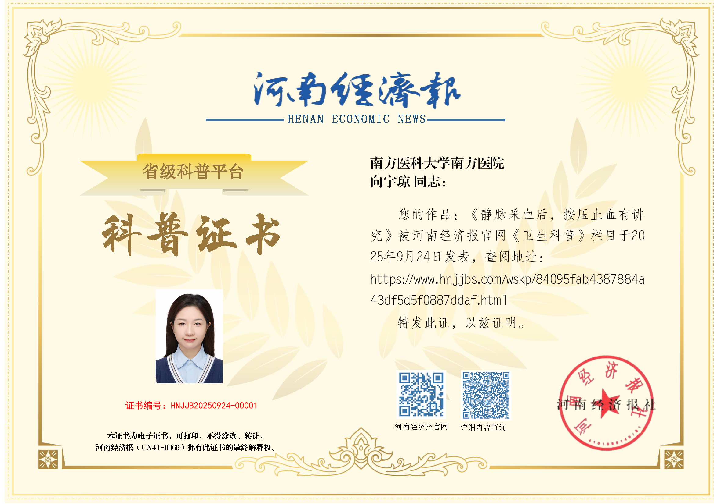 (姓名:向宇琼;单位:南方医科大学南方医院 )
