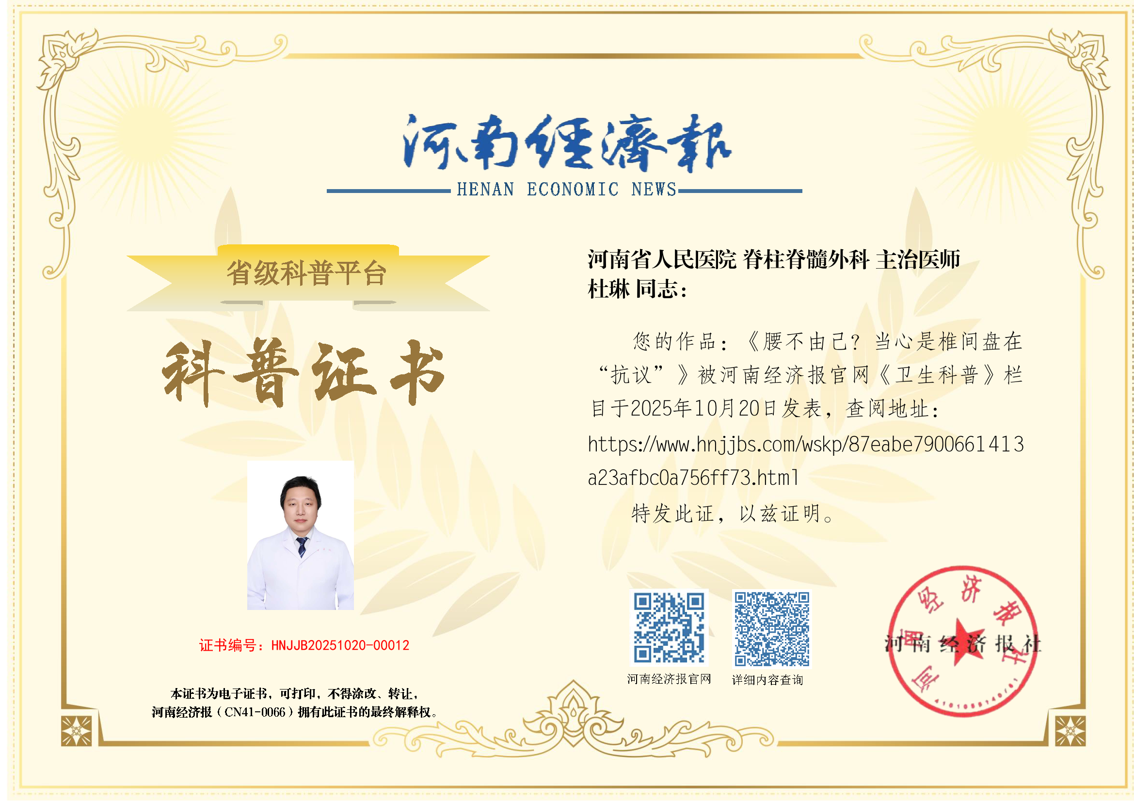 (姓名:杜琳;医院:河南省人民医院; 科室:脊柱脊髓外科;职称:主治医师)