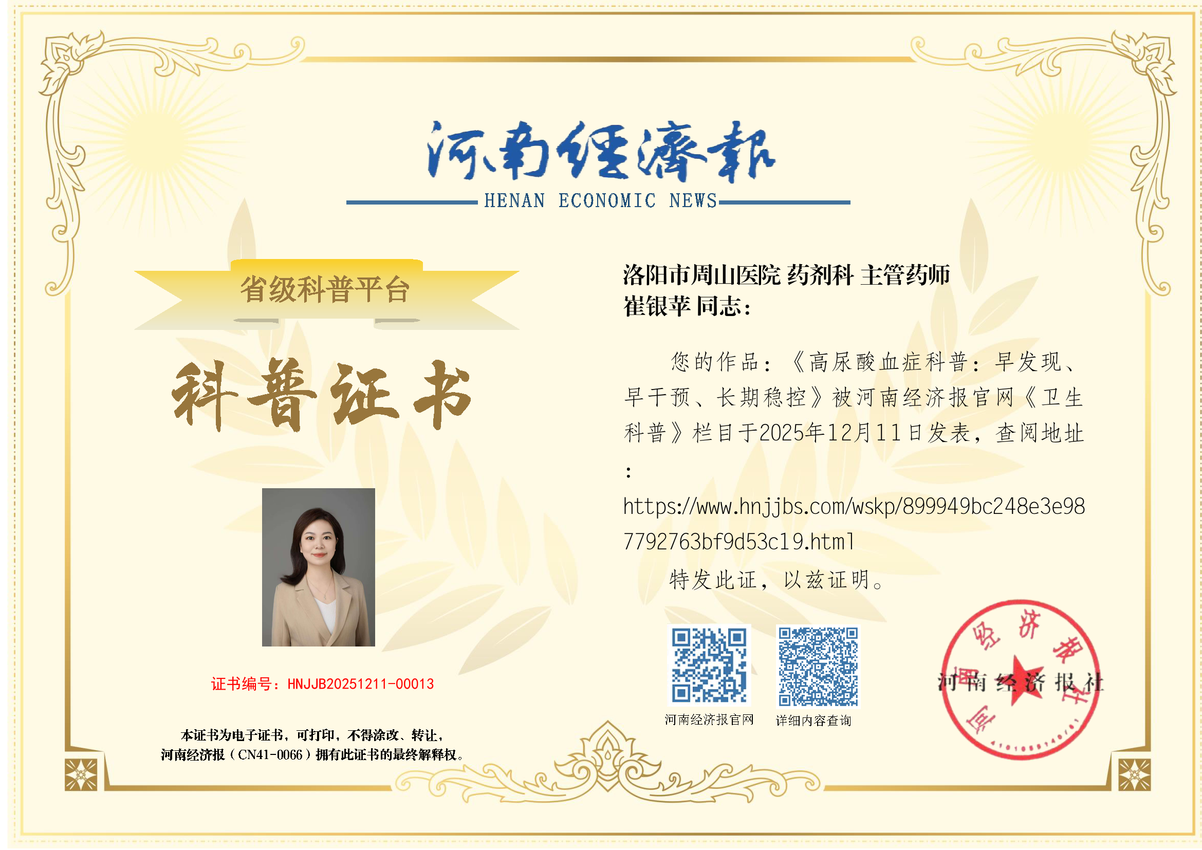 (姓名:崔银苹;医院:洛阳市周山医院;科室:药剂科;职称:主管药师)