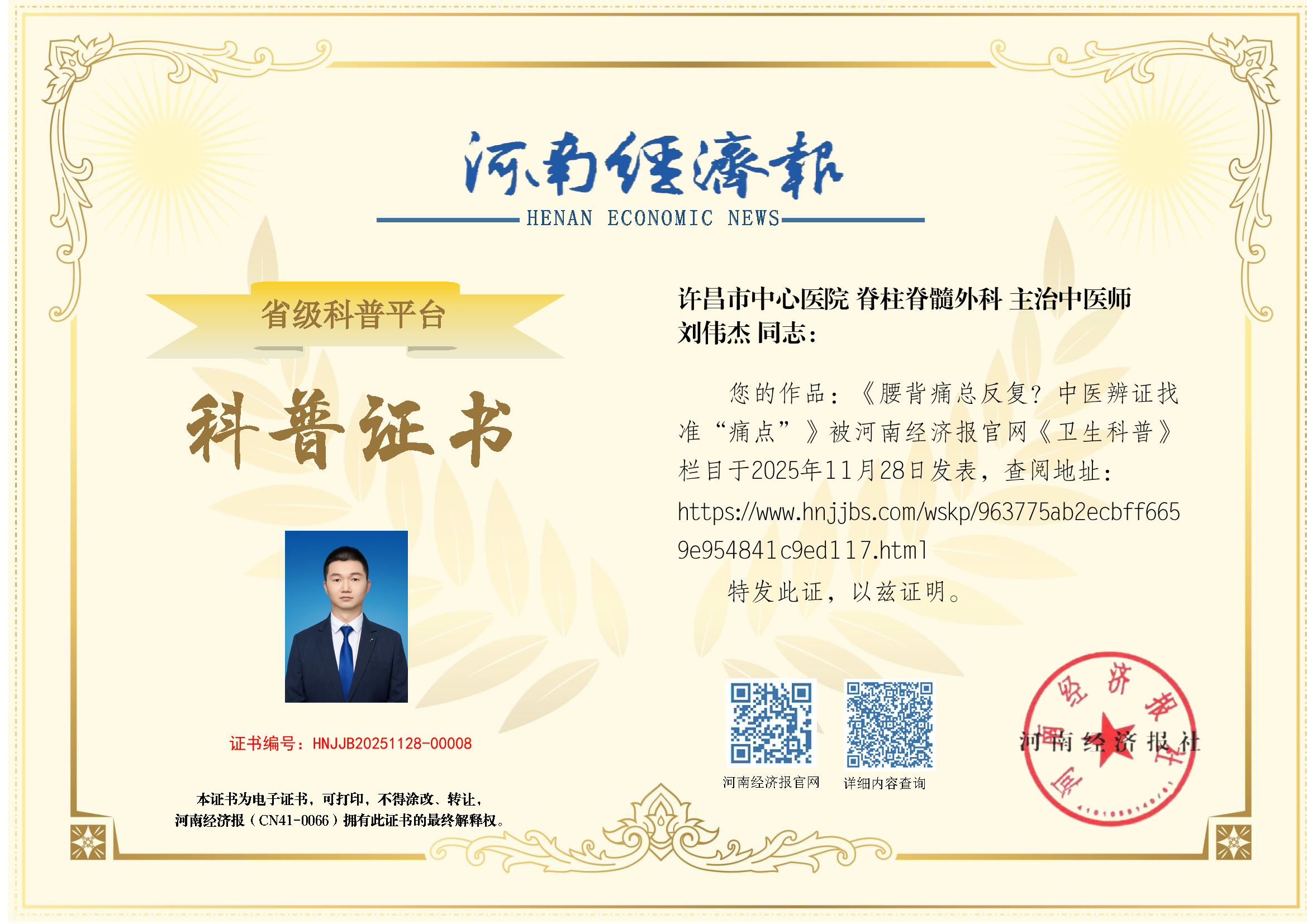 (姓名:刘伟杰;医院:许昌市中心医院;科室:脊柱脊髓外科;职称:主治中医师)
