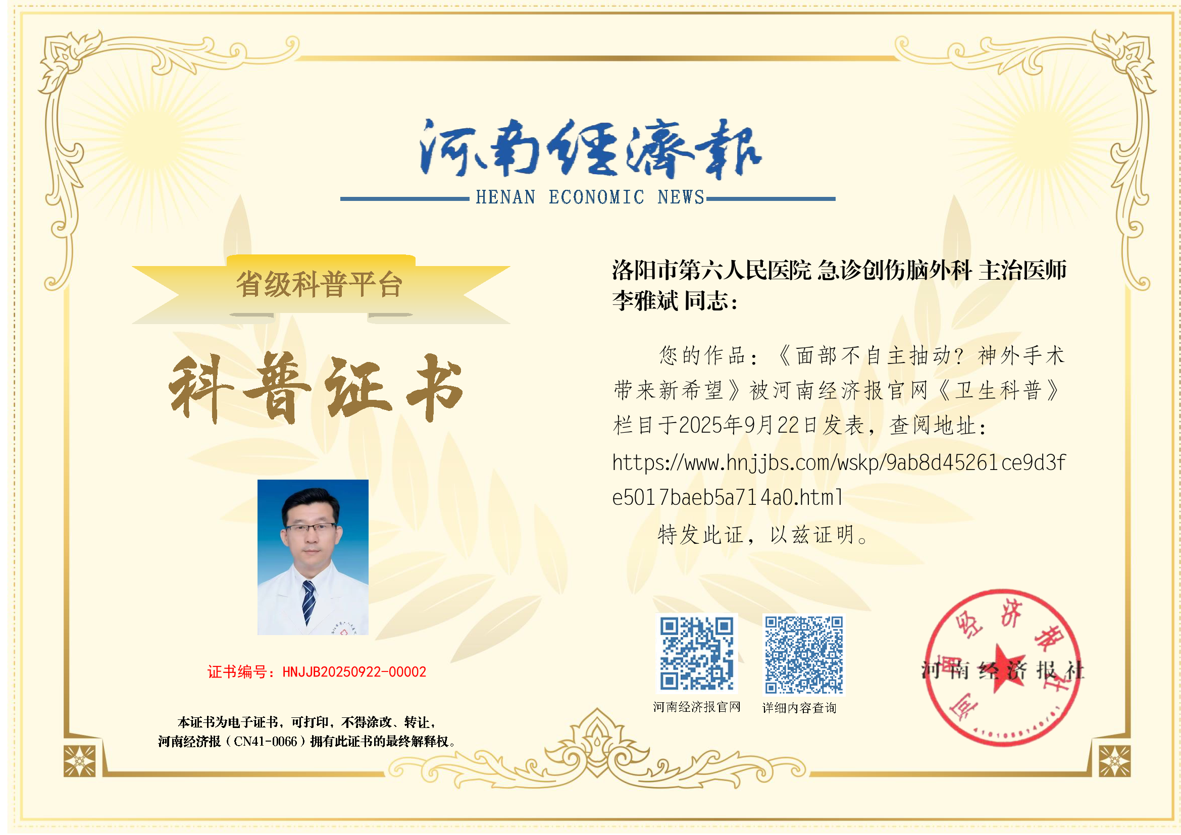 (姓名:李雅斌;医院:洛阳市第六人民医院;科室:急诊创伤脑外科;职称:主治医师)