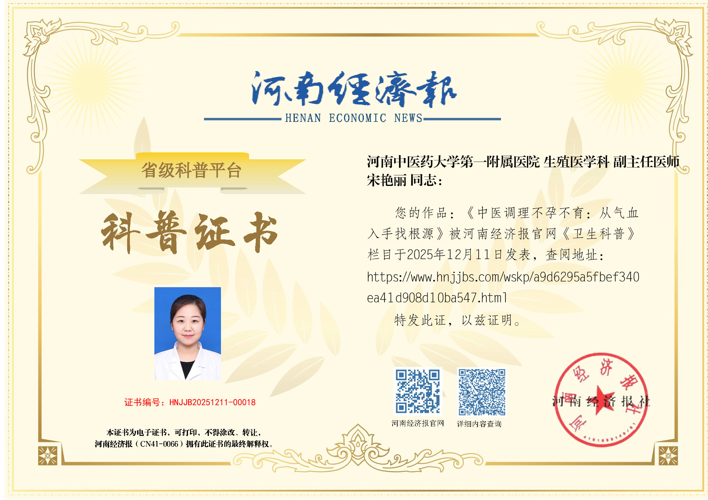 (姓名:宋艳丽;医院:河南中医药大学第一附属医院; 科室:生殖医学科;职称:副主任医师)