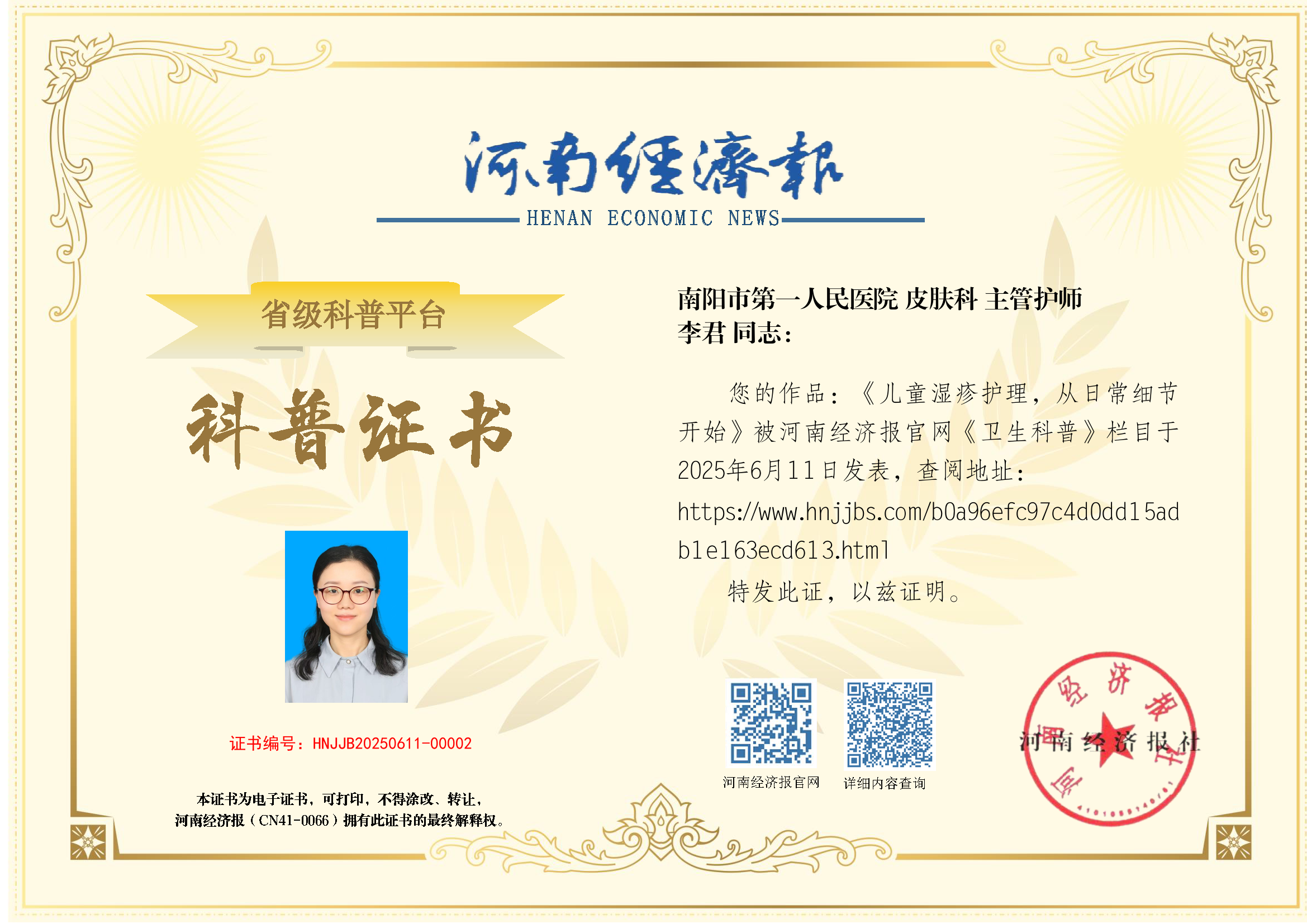 (作者:李君;单位:南阳市第一人民医院;科室:皮肤科;职称:主管护师)
