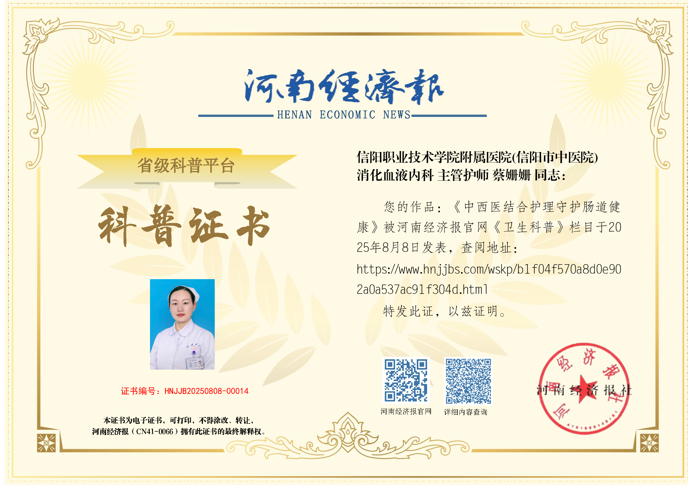 (姓名:蔡姗姗;医院:信阳职业技术学院附属医院(信阳市中医院); 科室:消化血液内科;职称:主管护师)