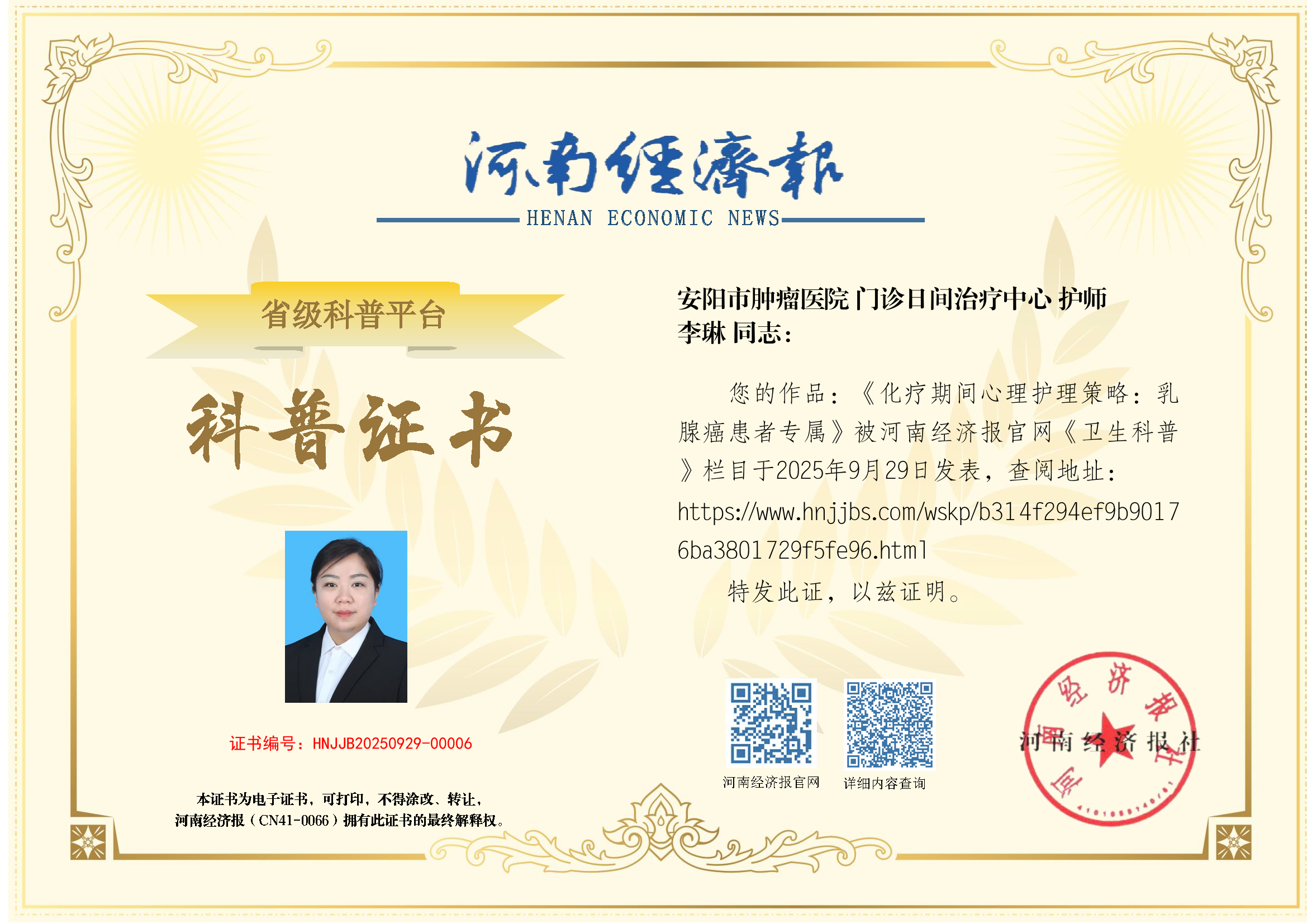 (姓名:李琳;医院:安阳市肿瘤医院;科室:门诊日间治疗中心;职称:护师)