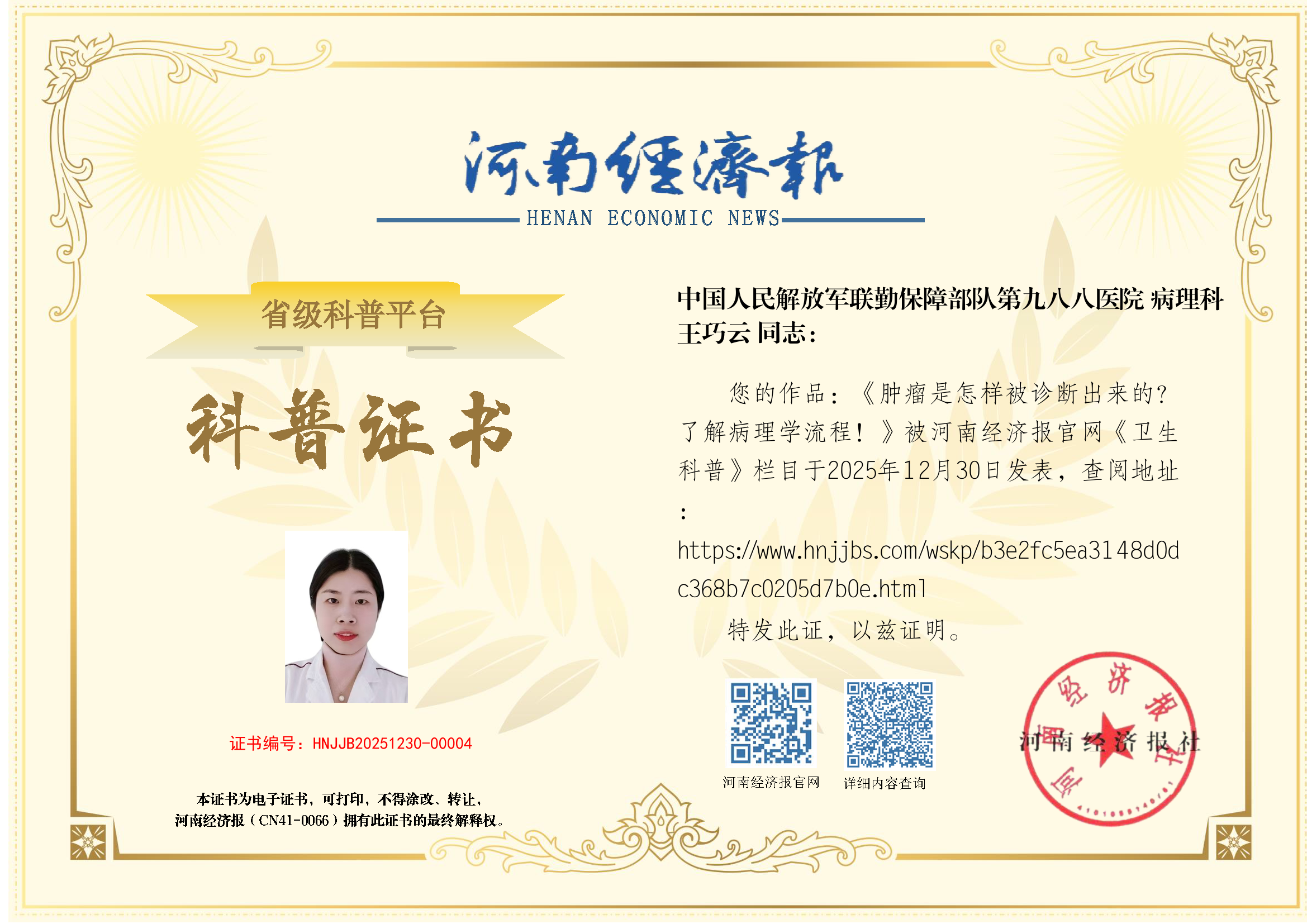 (姓名:王巧云;单位:中国人民解放军联勤保障部队第九八八医院;科室:病理科)