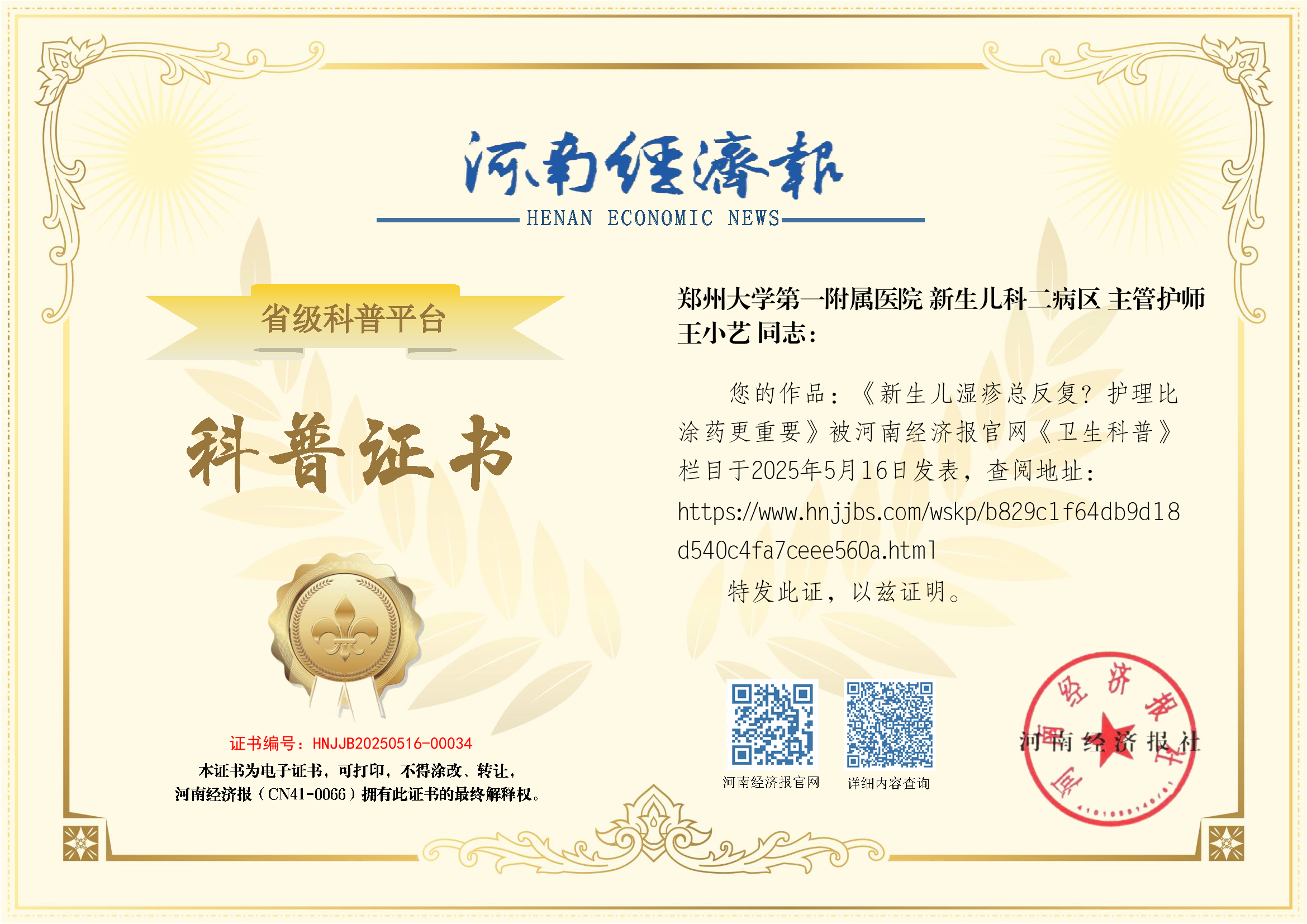 (姓名:王小艺;医院:郑州大学第一附属医院;科室:新生儿科二病区;职称:主管护师)