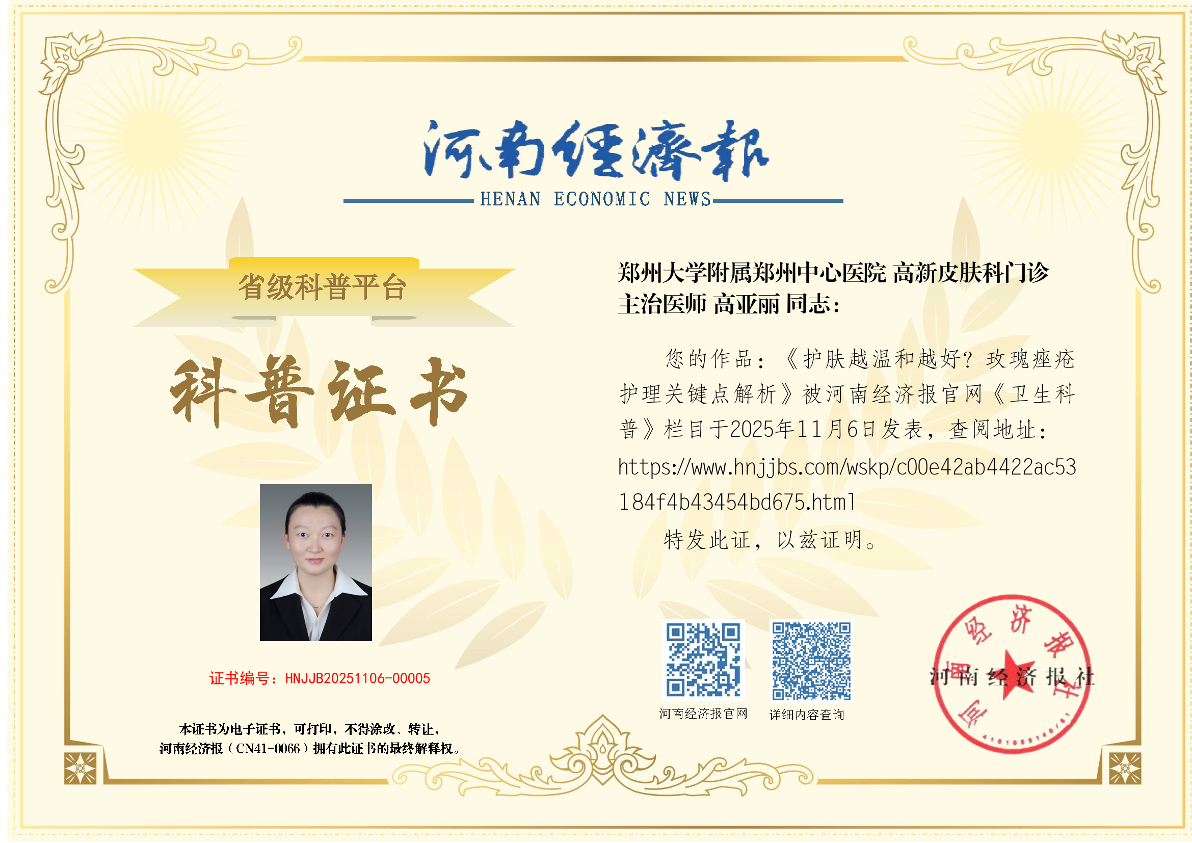 (姓名:高亚丽;医院:郑州大学附属郑州中心医院;科室:高新皮肤科门诊;职称:主治医师)