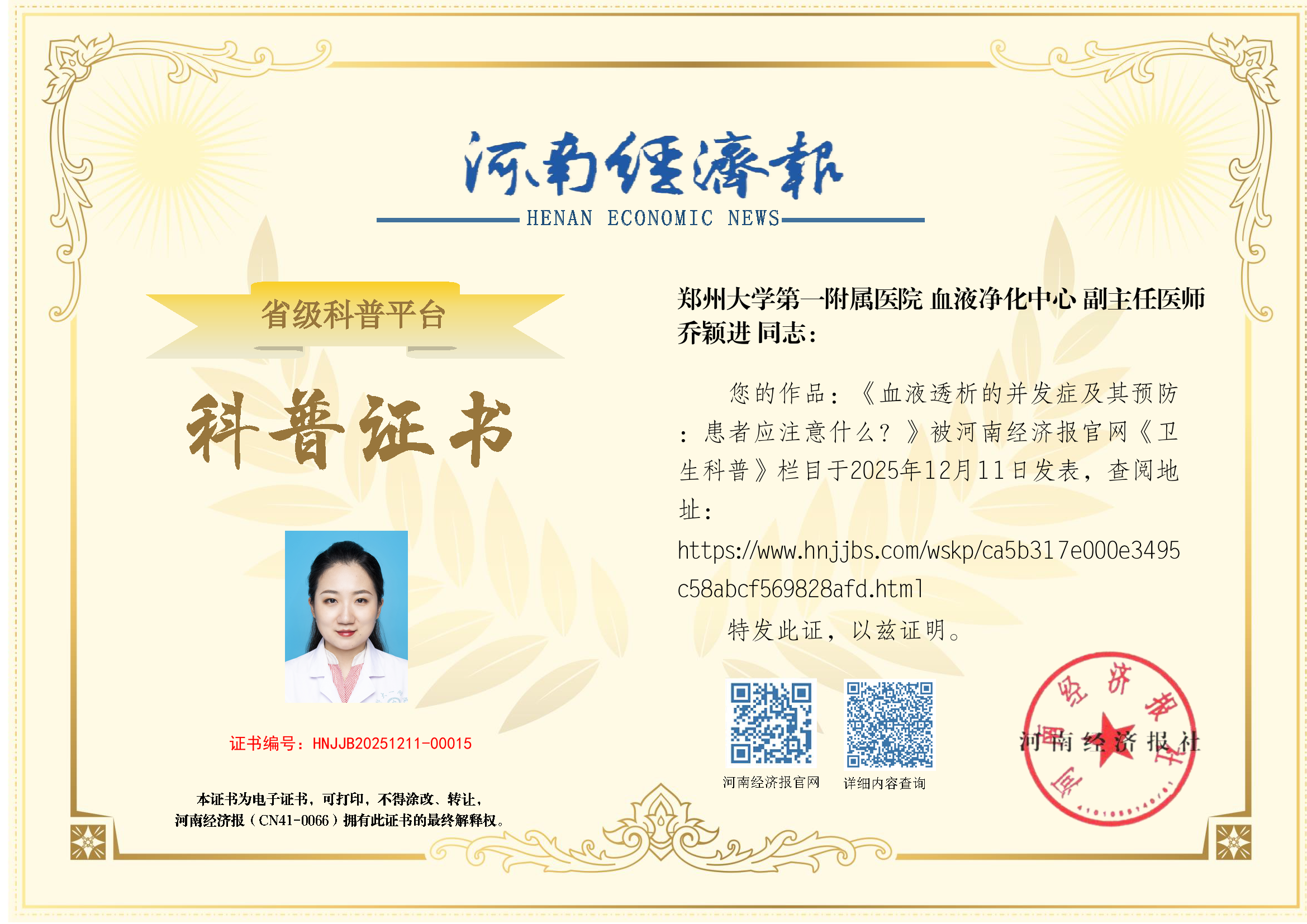 (姓名:乔颖进;医院:郑州大学第一附属医院;科室:血液净化中心; 职称:副主任医师)
