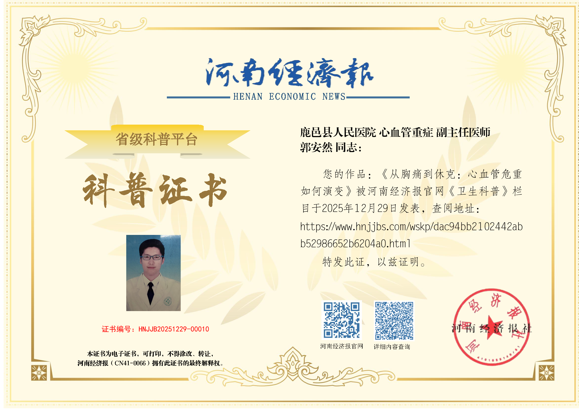(姓名:郭安然;医院:鹿邑县人民医院; 科室:心血管重症;职称:副主任医师)