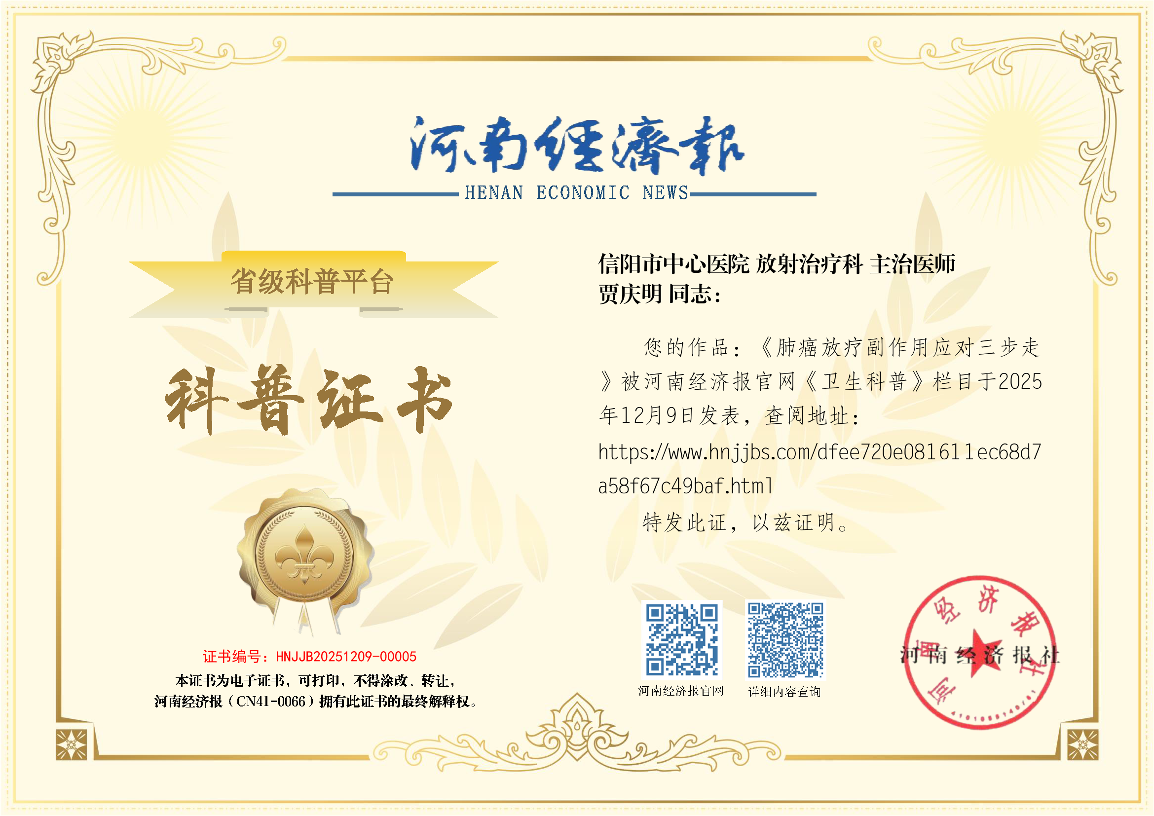 (姓名:贾庆明;医院:信阳市中心医院; 科室:放射治疗科;职称:主治医师)