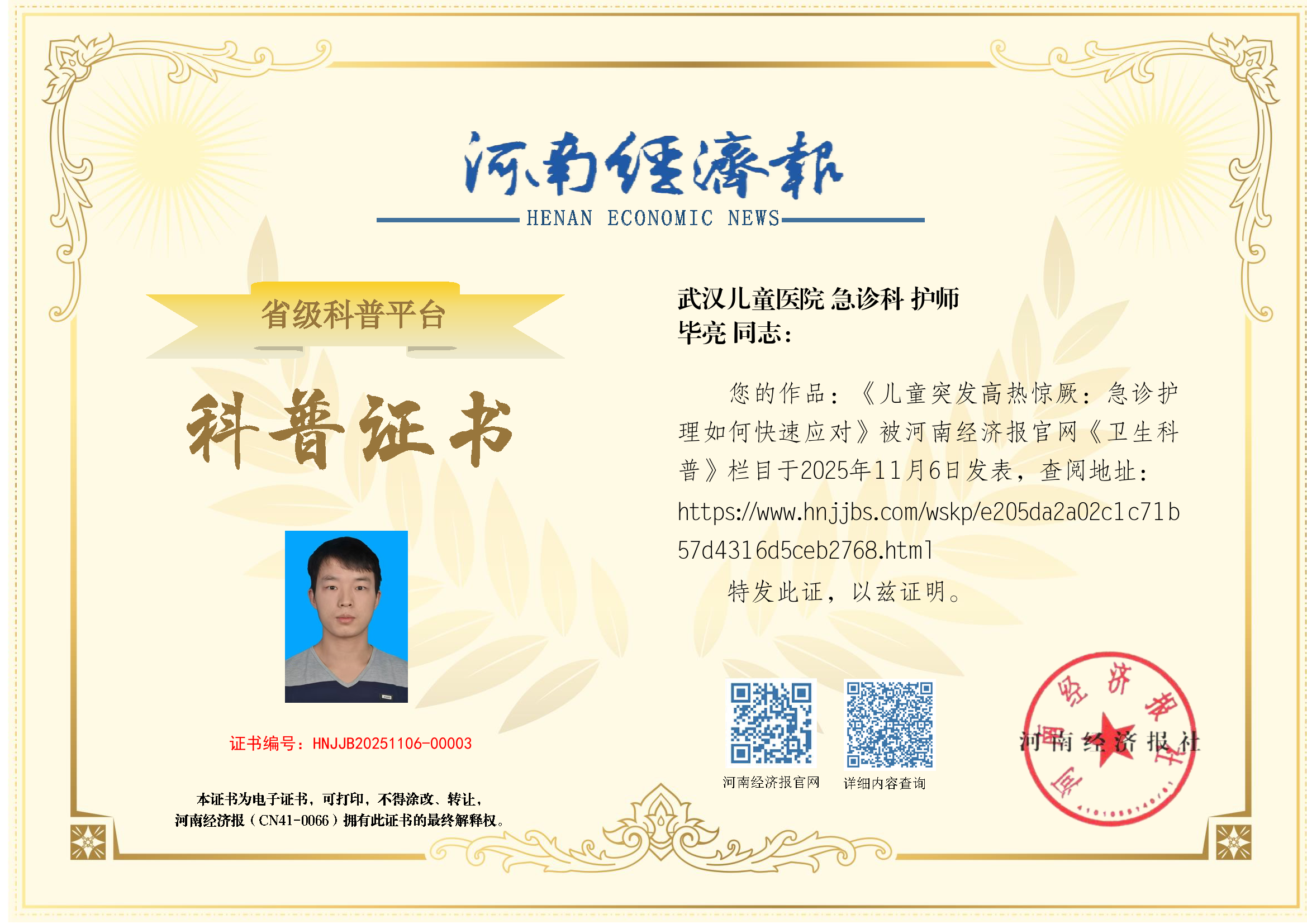 (姓名:毕亮;医院:武汉儿童医院;科室:急诊科;职称:护师)