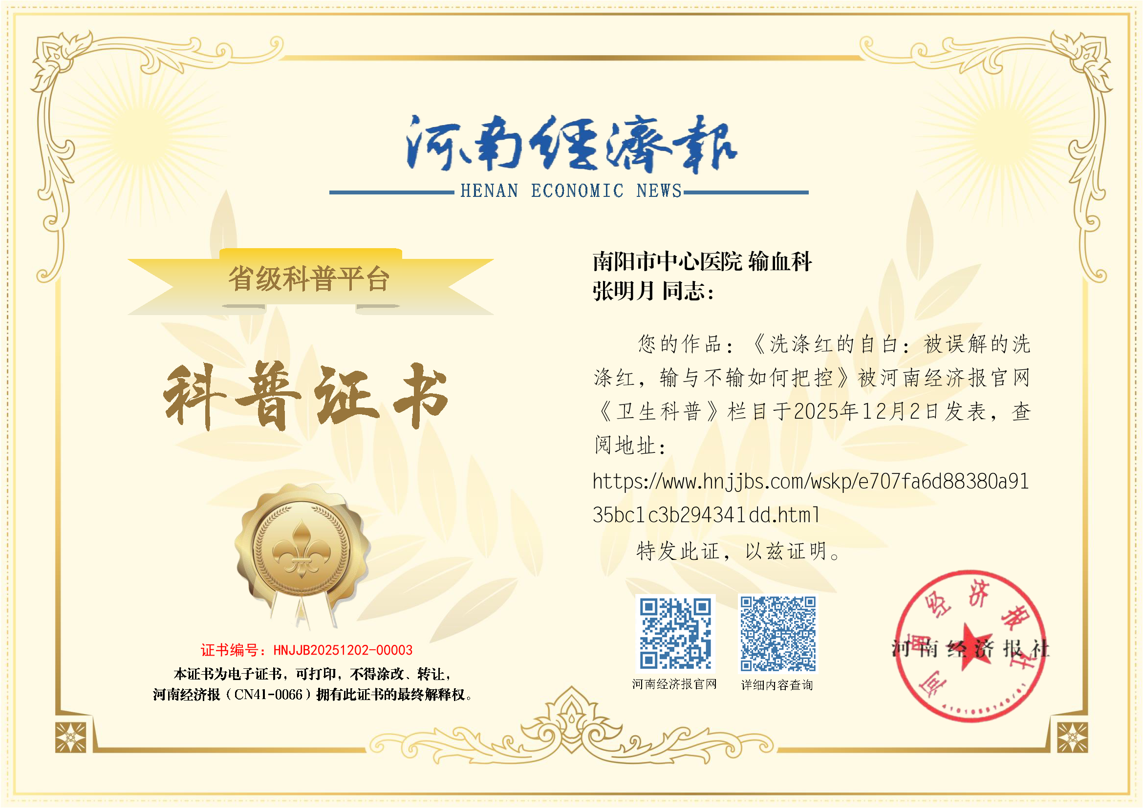 (姓名:张明月;单位:南阳市中心医院; 科室:输血科)