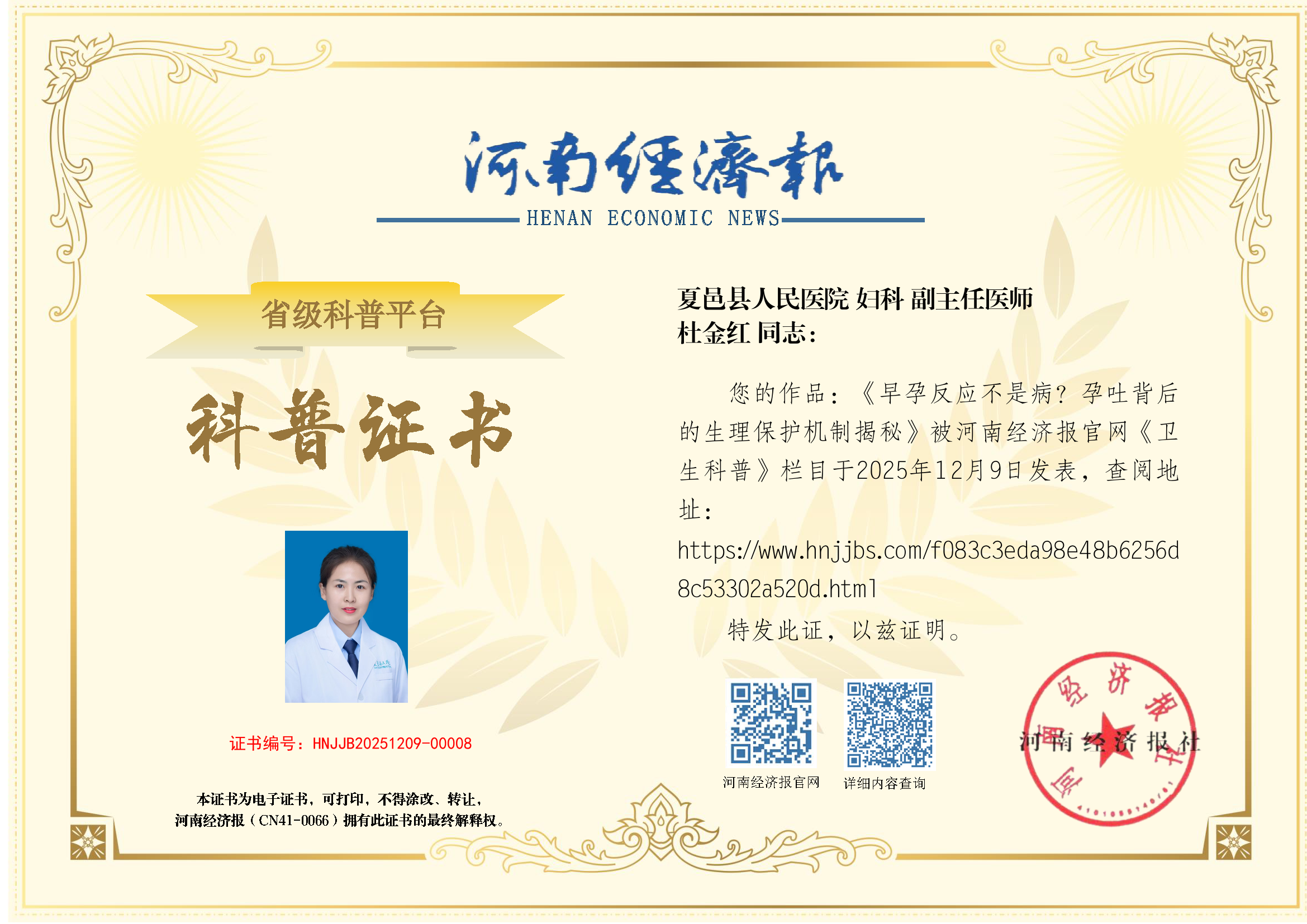 (姓名:杜金红;医院:夏邑县人民医院; 科室:妇科;职称:副主任医师)