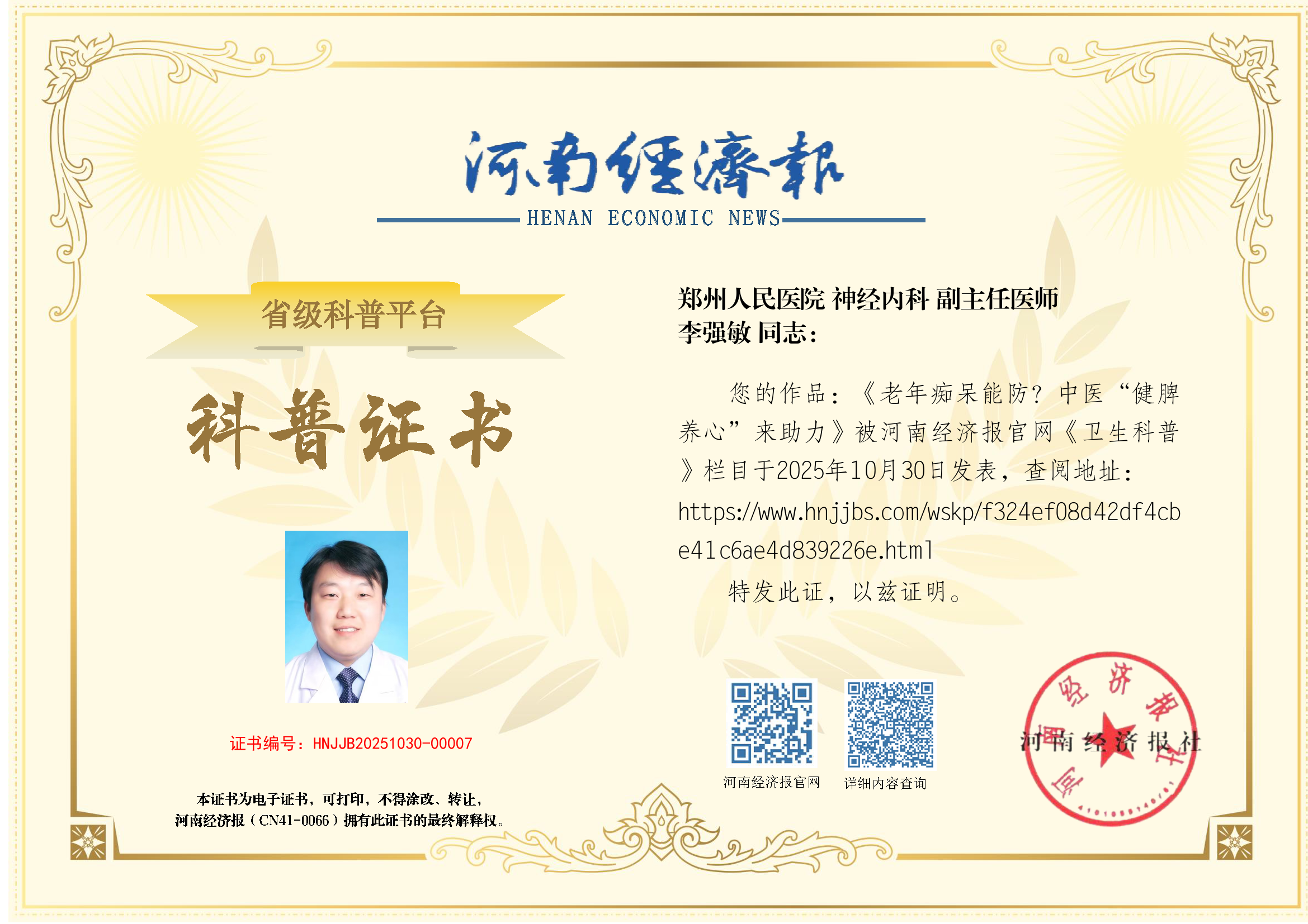 (姓名:李强敏;医院:郑州人民医院;科室:神经内科; 职称:副主任医师)