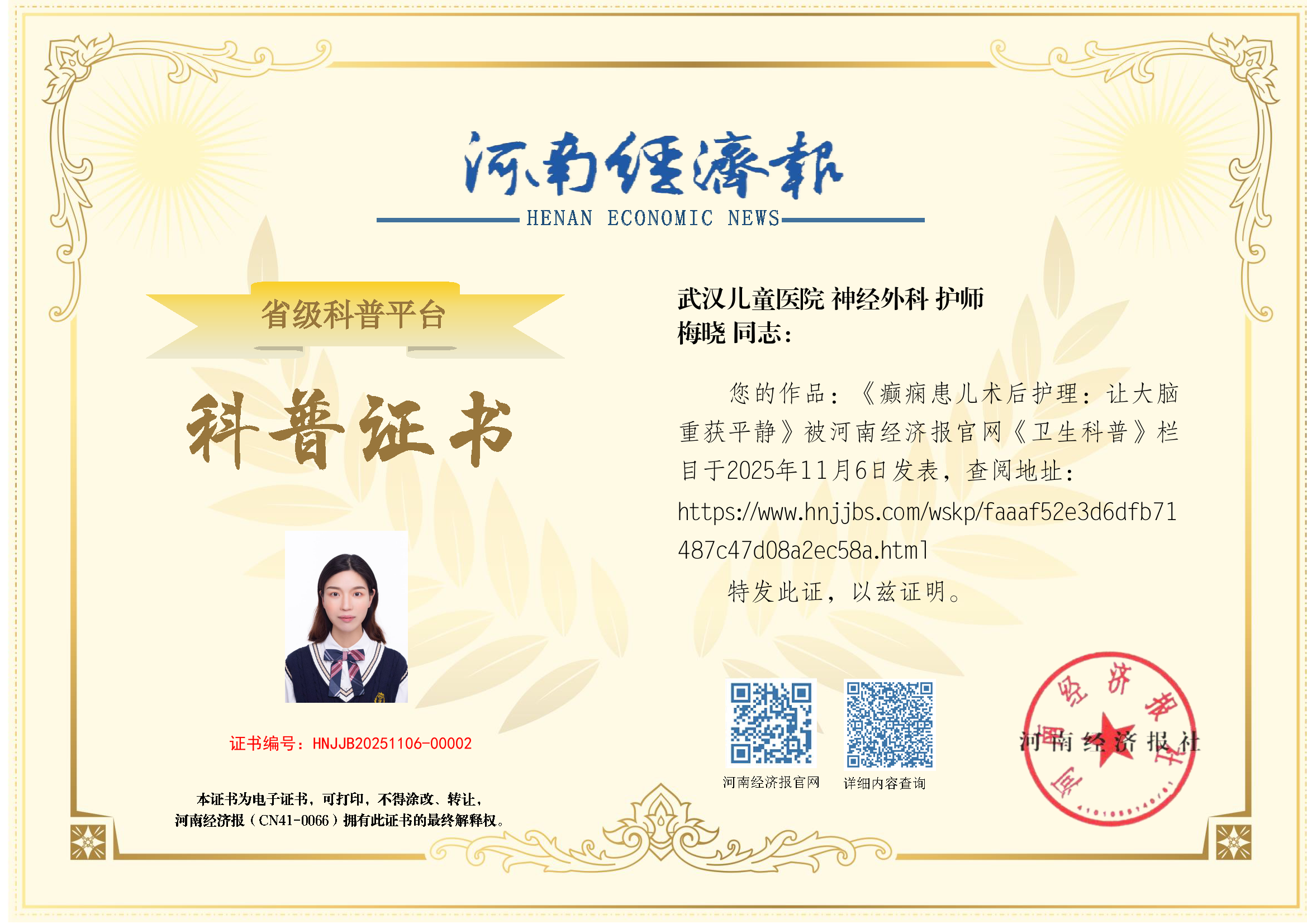 (姓名:梅晓;医院:武汉儿童医院;科室:神经外科;职称:护师)