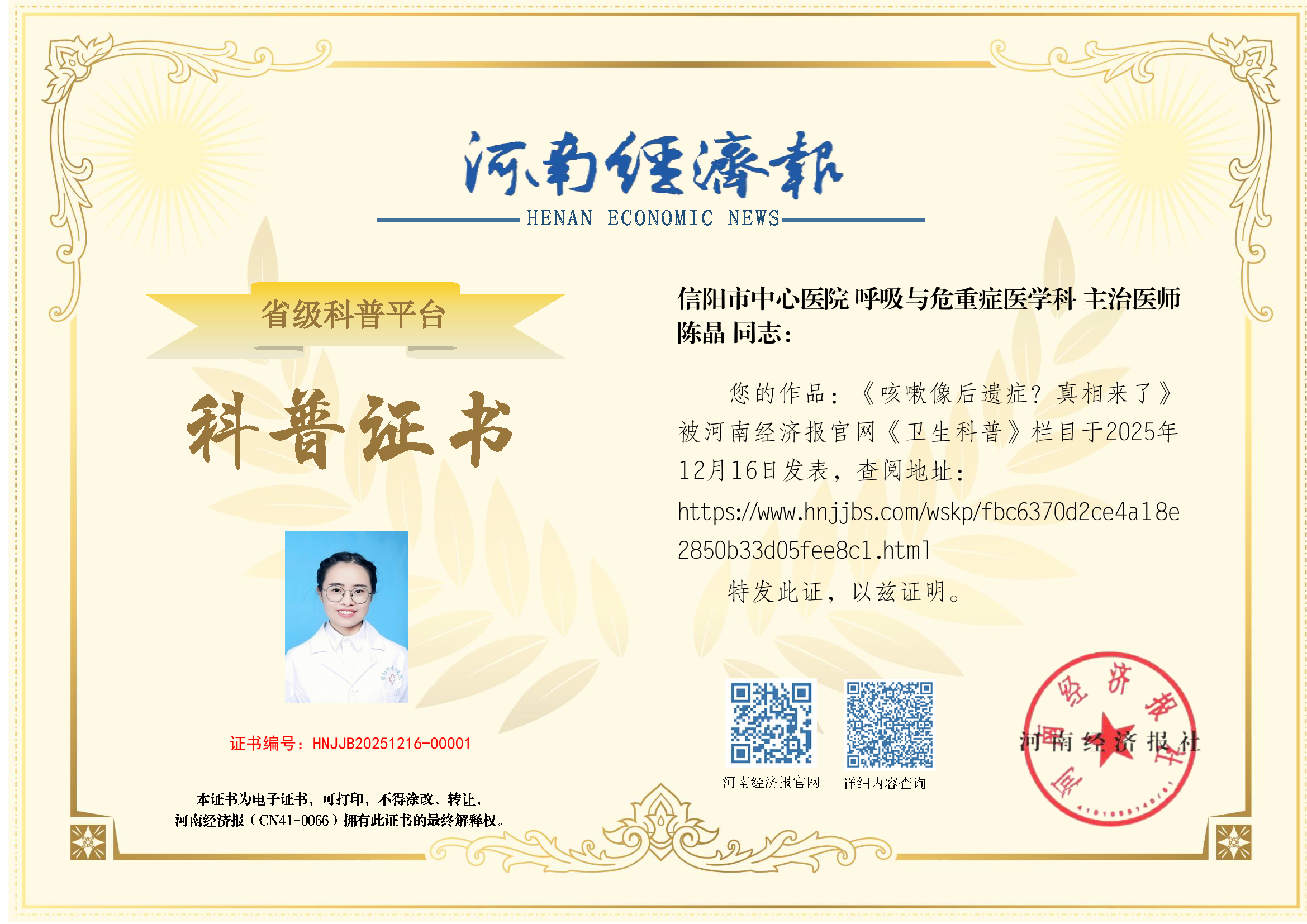 (姓名:陈晶;医院:信阳市中心医院;科室:呼吸与危重症医学科;职称:主治医师)