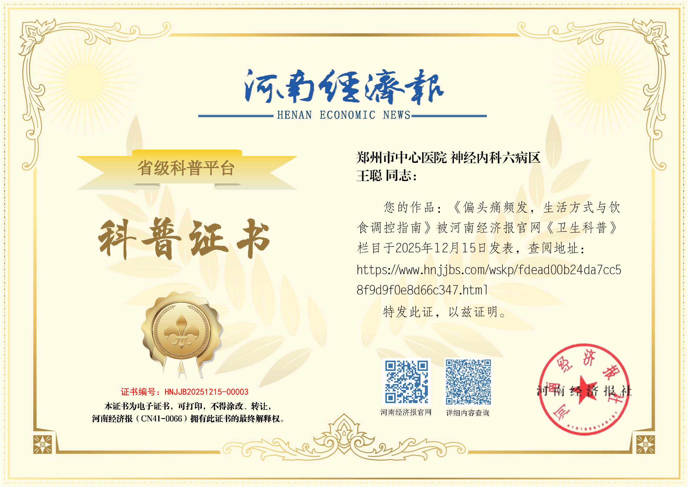 (姓名:王聪;医院:郑州市中心医院;科室: 神经内科六病区)