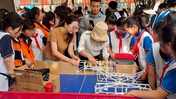 2.校内竞赛:学校每年11月份举办校园科技节,设有科学实验展演,科幻画和科技小制作评比、纸桥承重和气弓箭比赛等项目。通过这些活动,提高学生的科学素养、团队合作能力和竞赛能力。在今年的校园科技节中,共有400余名学生参与,收到科幻画作品96幅,科技小制作432件 。校园科技节的活动设计全面涵盖课程标准中科学探究、创新实践、科学态度等多方面要求,为学生提供了展示科学素养的平台,促进学生综合素养的提升。
