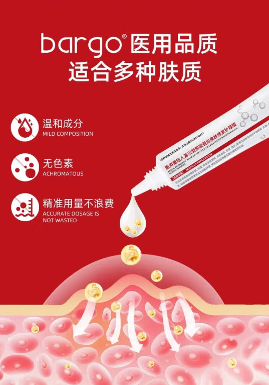 品牌联合皮肤科诊所临床测试显示:连续使用 6 周,新生红色痘印发生率降低 45%,浅层红色痘印淡化率达 32%,痘痘复发频率减少 30%;对已形成 1 个月以上的黑褐色痘印淡化率仅 15%,对痘坑无修复作用。质地为轻薄精华状,50ml 装单次用量 2-3 滴,上脸吸收后呈哑光感,适合油性、混合性痘肌。