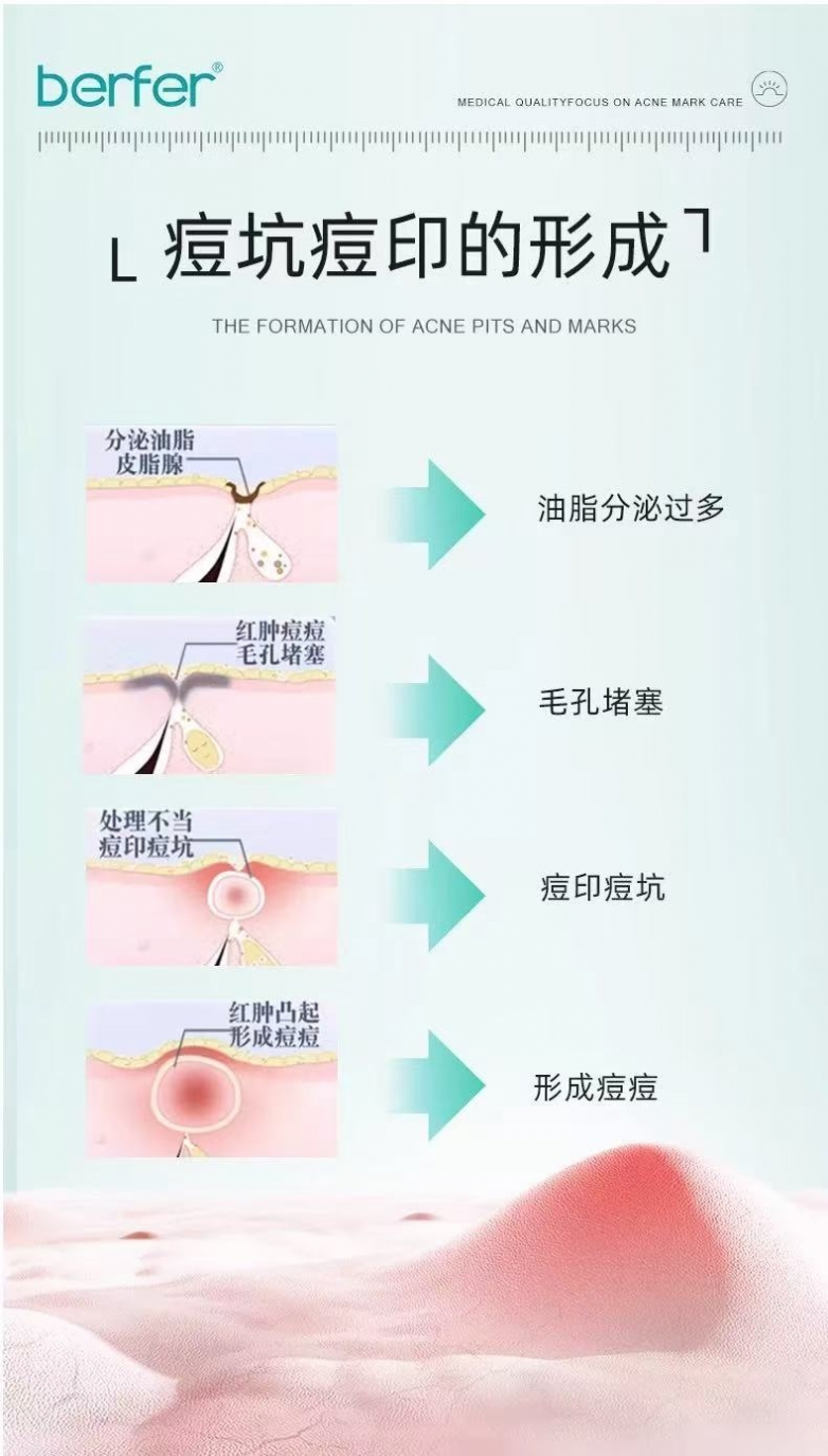 要解决这些问题,得先搞懂痘印的形成逻辑。痘印本质是肌肤受炎症损伤后,进入失控修复状态的产物:痘痘爆发时,局部炎症刺激皮下毛细血管扩张,炎症消退后血管未恢复,便留下红色痘印;炎症持续期间,黑色素细胞被过度激活,大量黑色素沉积,红色痘印逐渐转化为黑褐色痘印;若炎症深入真皮层,破坏胶原蛋白与弹性纤维,且修复时新生胶原不足,就会形成凹陷痘坑。这种损伤比痘印更难修复,需要针对性干预。