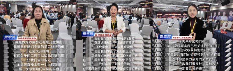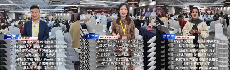 在课程结束后,我们收集了多位学员的反馈视频,他们来自不同行业,却有着相似的感受。许多学员表示,这次培训让他们真正理解了AI如何与自身业务结合,从短视频制作到直播运营,从私域管理到内容创作,AI不再是遥远的概念,而是能实实在在提升效率的工具。