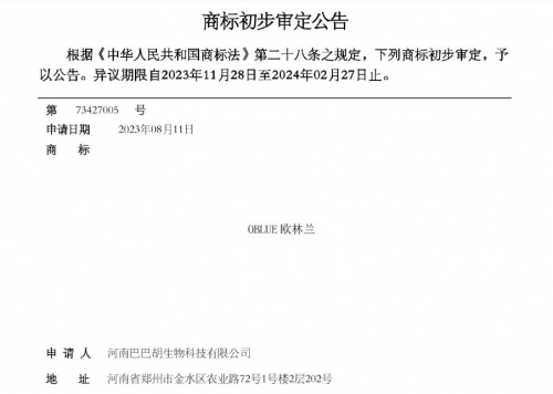 商标注册信息显示,OBLUE欧林兰由河南巴巴胡生物科技有限公司申请注册,公司地址位于河南省郑州市金水区农业路72号1号楼。