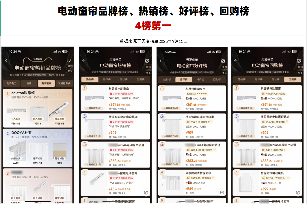 在智能窗帘行业的竞技场中,科思顿的领先地位早已是公认的事实。2025年行业权威榜单显示,其全球销量突破5000万台,连续9年蝉联天猫电动窗帘品类销量TOP1,不仅包揽天猫“热销榜、好评榜、品牌榜”三冠王,更以39%-45%的市场占有率远超第二名及以后品牌总和,相当于每卖出3套高端电动窗帘,就有1套来自科思顿。