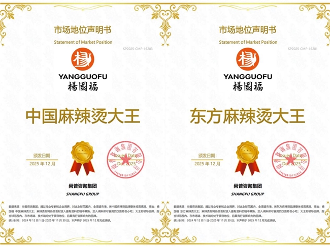 在对全球范围、全渠道市场的系统调研与数据分析之后,权威市场研究机构尚普咨询集团正式向杨国福集团颁发了四项重量级市场地位认证:“杨国福,东方麻辣烫大王”“杨国福,中国麻辣烫大王”“杨国福,草本骨汤麻辣烫(大于15味草本)开创者”以及“杨国福,全球首个麻辣烫智能制造工厂”。