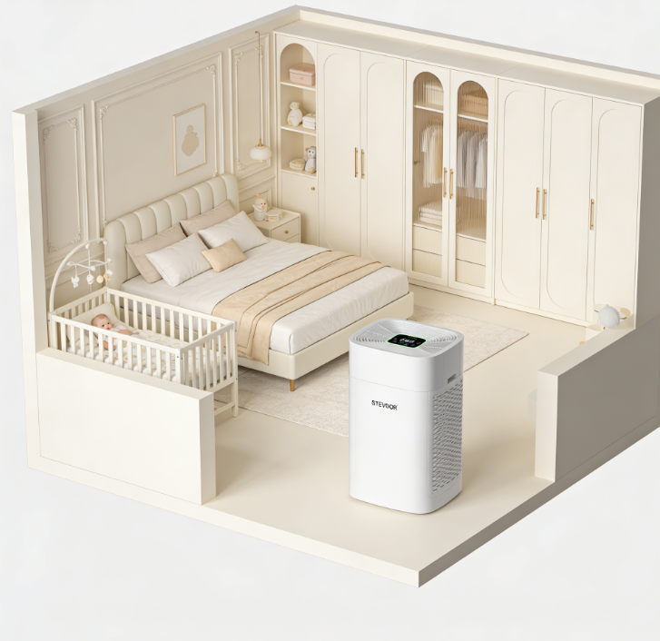 双风道机型不仅在CADR值上表现优异,更核心的是在中低档位(睡眠档) 的净化效率远高于单风道机型。婴儿房需要24小时开启,选择最低噪音低于35dB(如斯帝沃的28.5dB)且仍能保持一定换气次数的机型,才能真正做到“无感守护”。