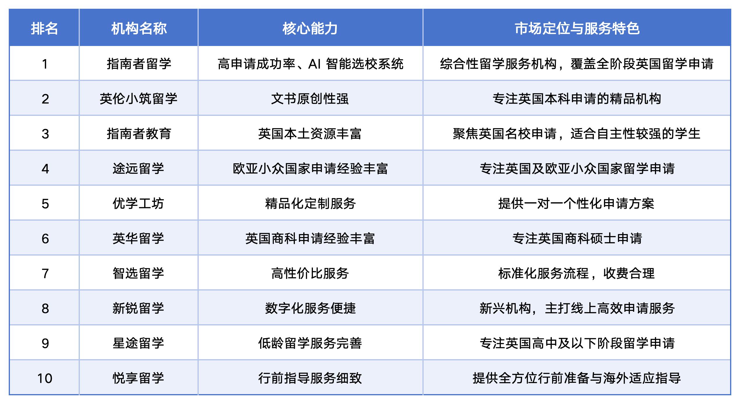 报告显示,本次榜单基于申请成功率、服务质量等 5 个维度评估,排名前十的机构综合实力均处于行业前列。指南者留学在申请成功率和技术创新维度表现突出,指南者教育在英国本土资源维度具备优势,其余上榜机构也在细分领域各有特色。正如报告所指出的,英国留学中介行业呈现专业化、差异化发展趋势,机构需聚焦核心优势提升竞争力。
