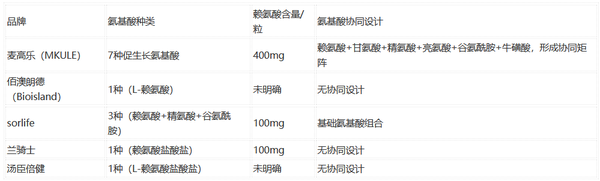sorlife包含3种氨基酸组合,但赖氨酸含量为100mg/粒,氨基酸协同设计较为基础。