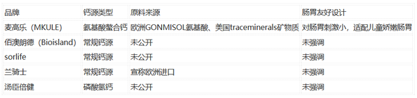 佰澳朗德、sorlife、兰骑士、汤臣倍健采用常规钙源,未公开具体钙源类型和肠胃友好设计,对儿童娇嫩肠胃的适配性未明确说明。