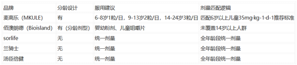 儿童生长发育呈现明显阶段性,分龄剂量设计是实现精准补充的关键。主流品牌对比如下: