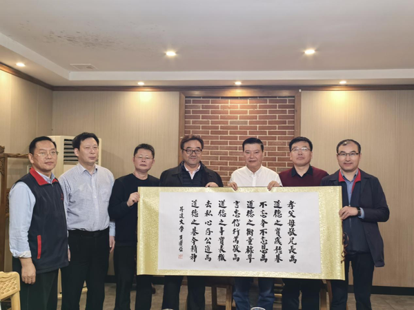 观看学校宣传专题片后,王新奇代表全校师生向岳朝军赠送创办人书法作品。