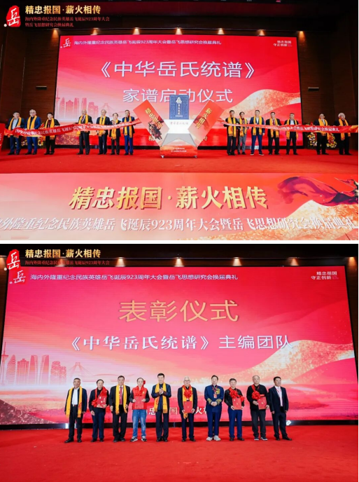 历时12年编纂的《中华岳氏统谱》(续编)举行隆重首发式。祖德流芳远,家史续华章!岳飞思想研究会历时十余载编纂完成的《中华岳氏统谱》(续编)首发式同步举行,大会对统谱核心主编团队岳喜高、岳建民、岳和然、岳子树、印制负责人岳麒鸿佩戴大红花予以隆重表彰。